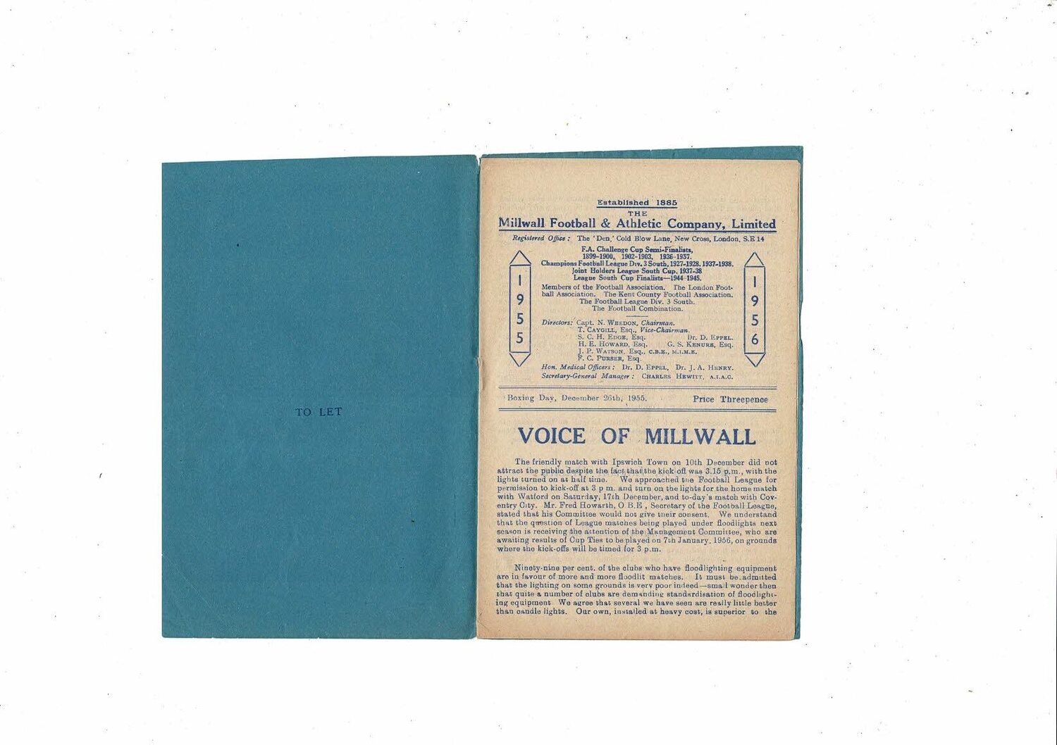 1955/56 Millwall v Coventry City Football Programme