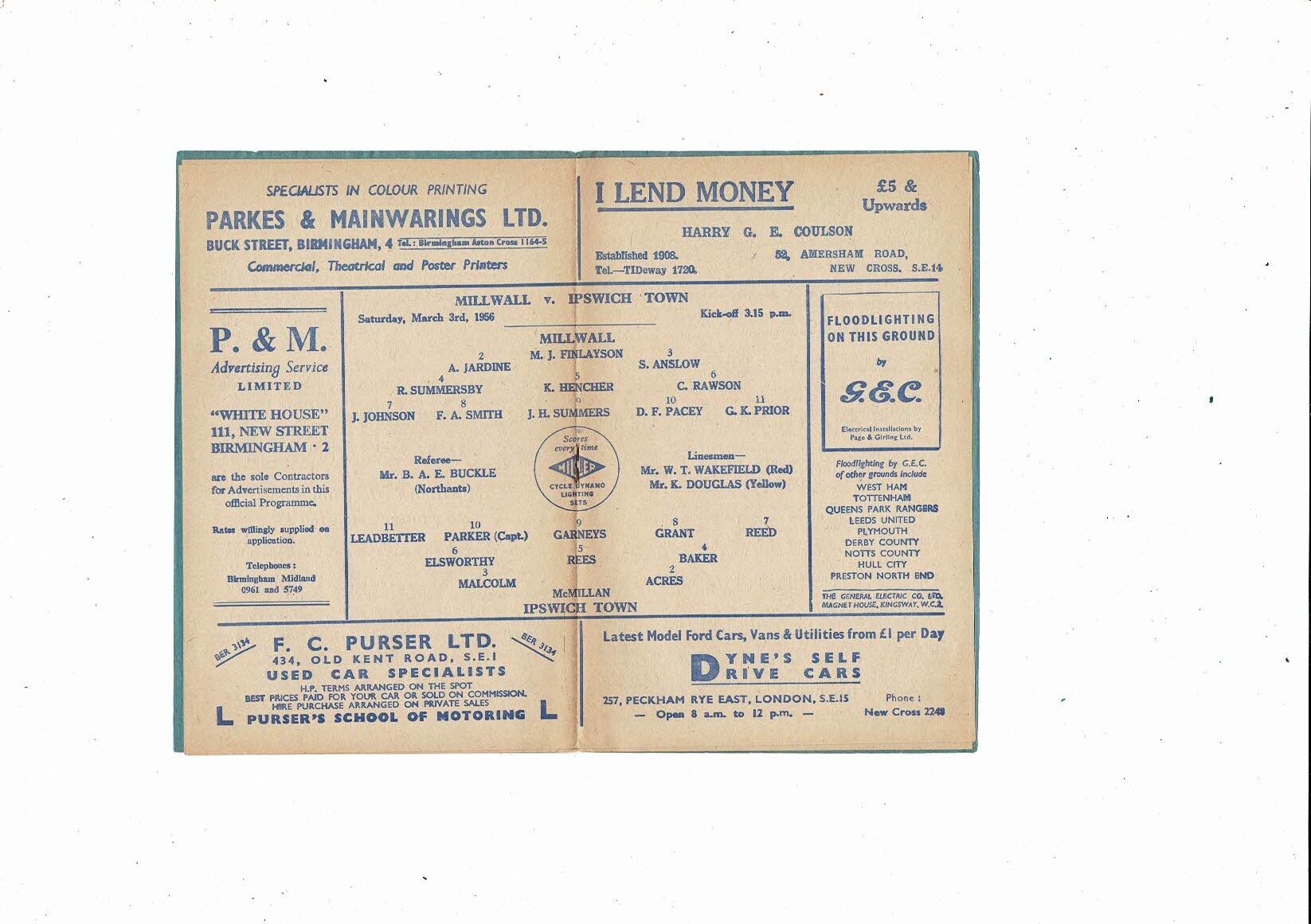 1955/56 Millwall v Ipswich Town Football Programme