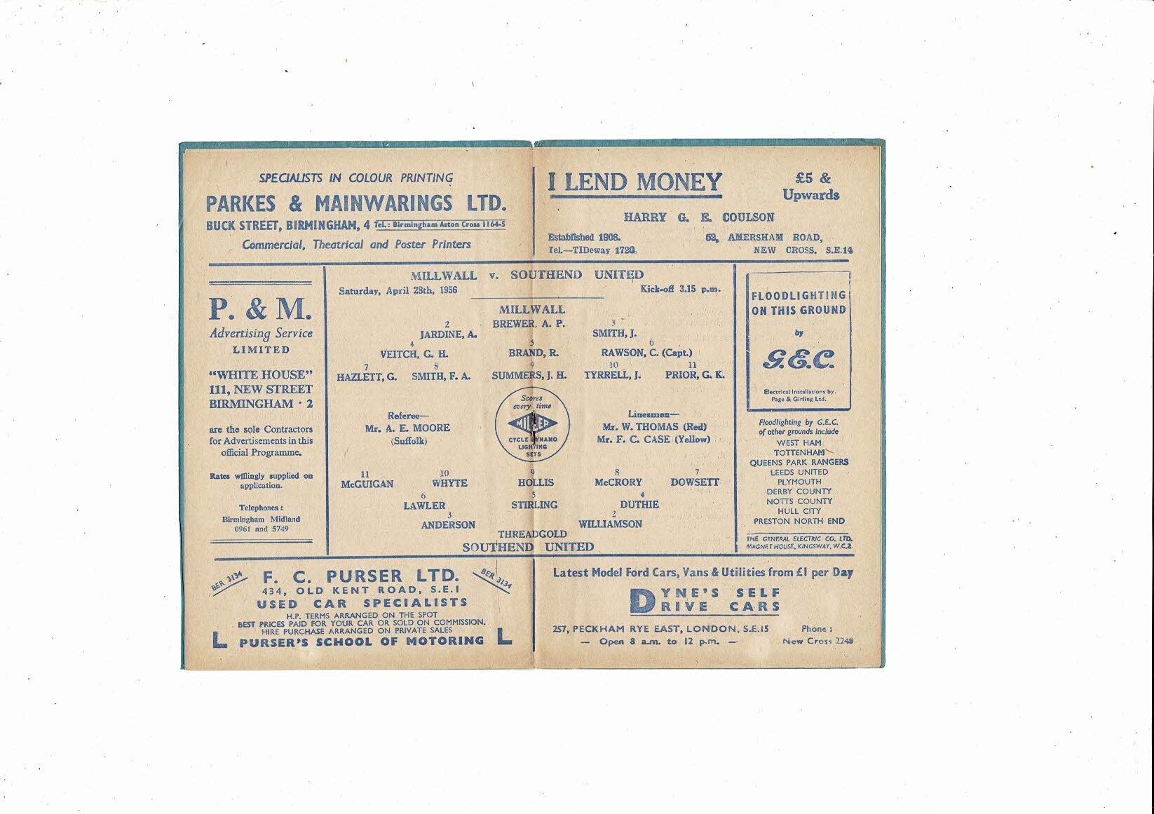 1955/56 Millwall v Southend United Football Programme
