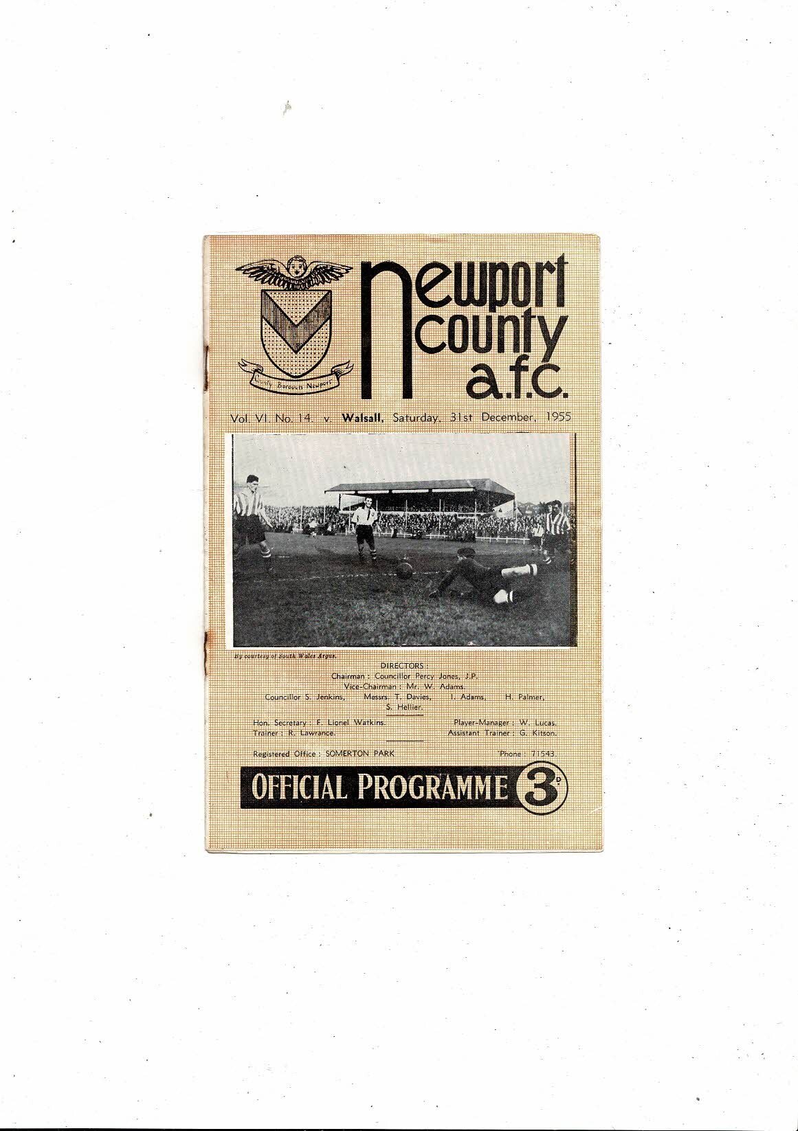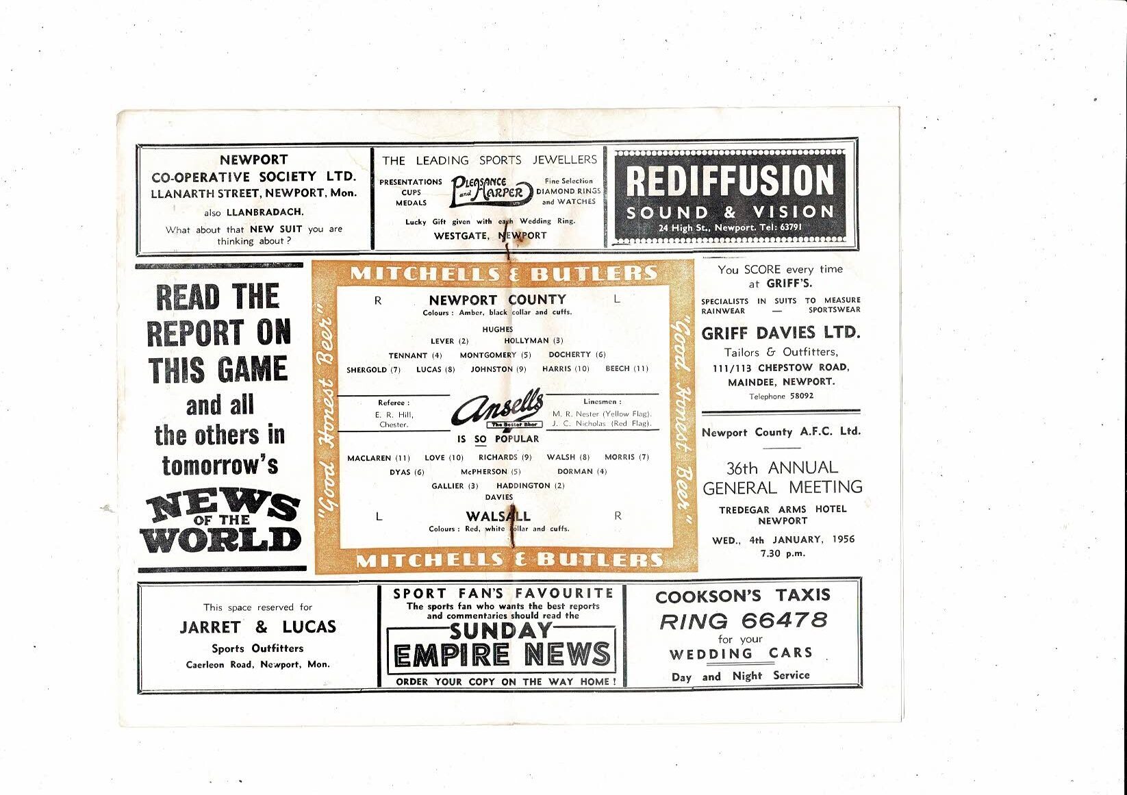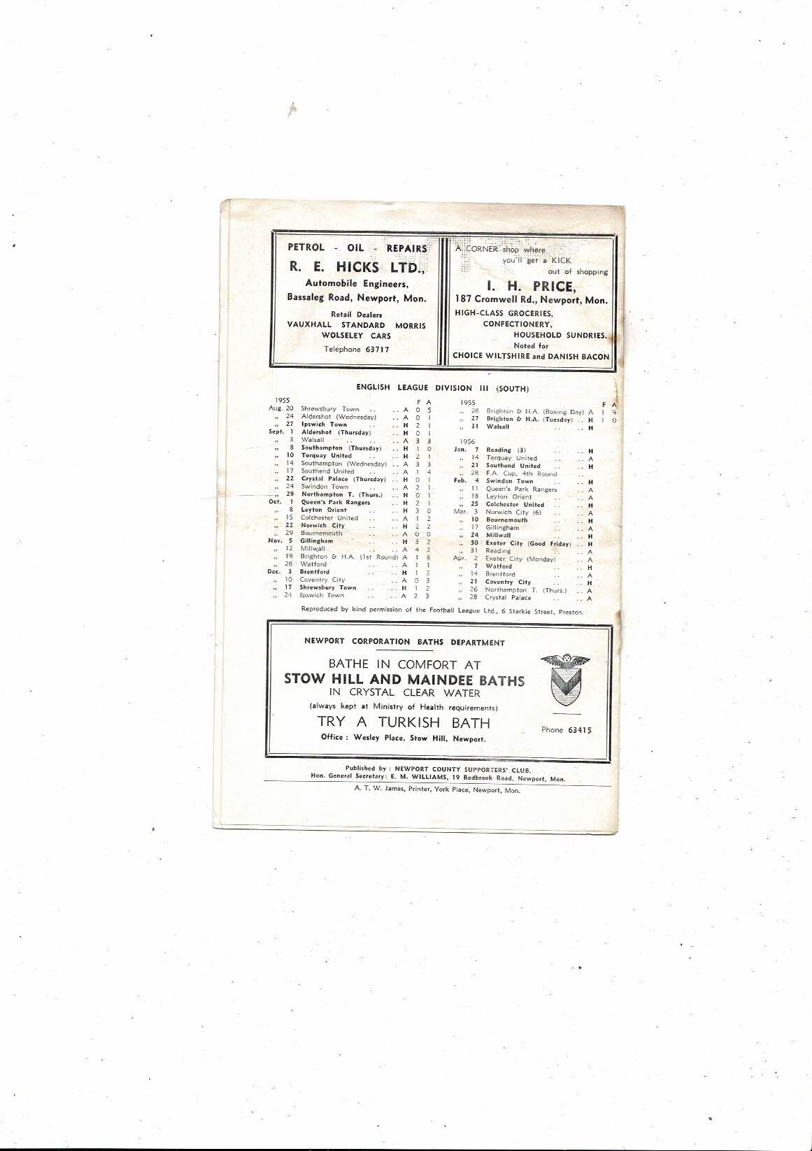 1955/56 Newport County v Walsall Football Programme