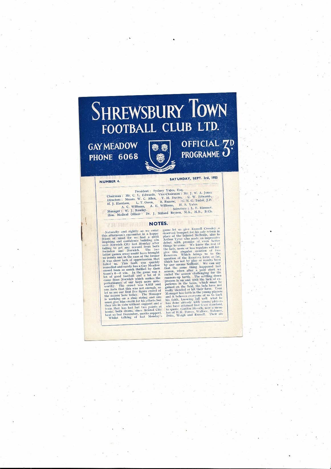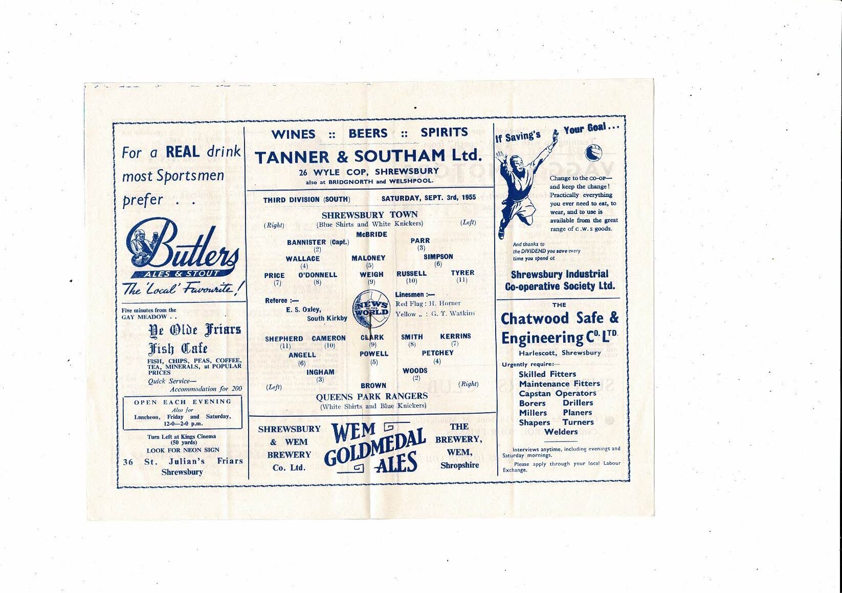 1955/56 Shrewsbury Town v Queens Park Rangers Football Programme