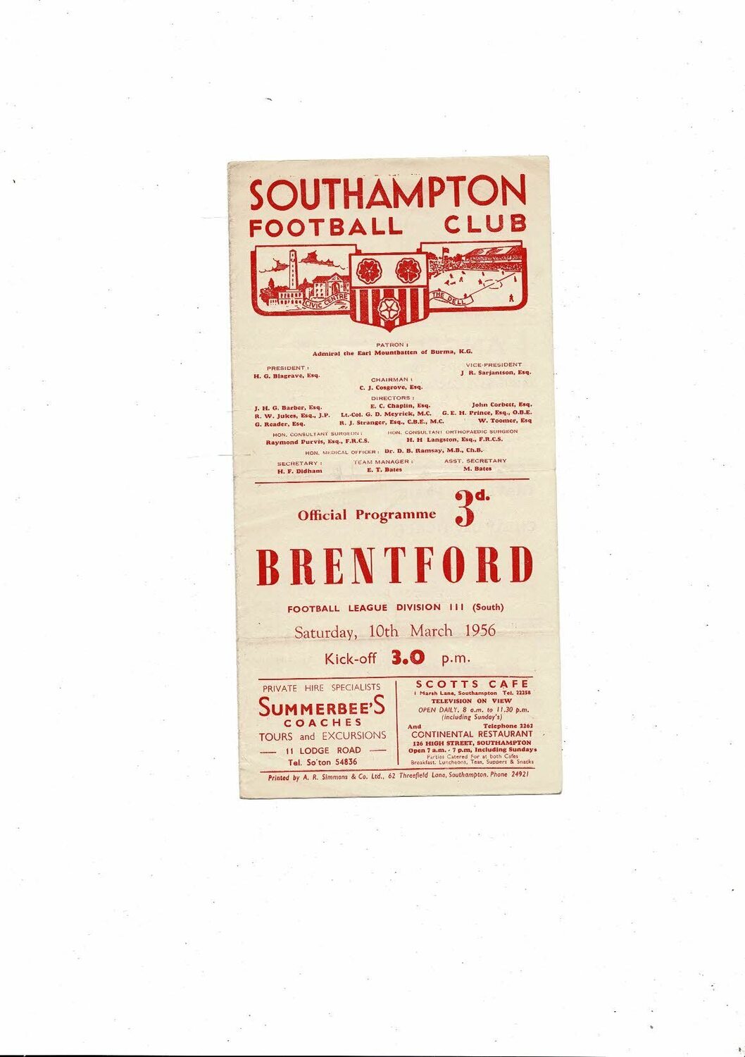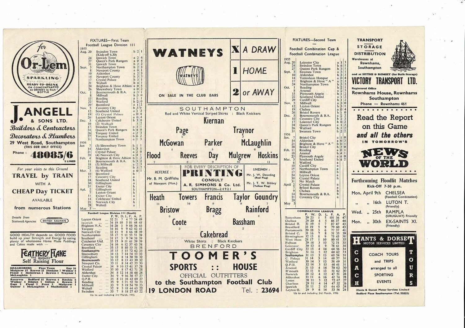 1955/56 Southampton v Brentford Football Programme