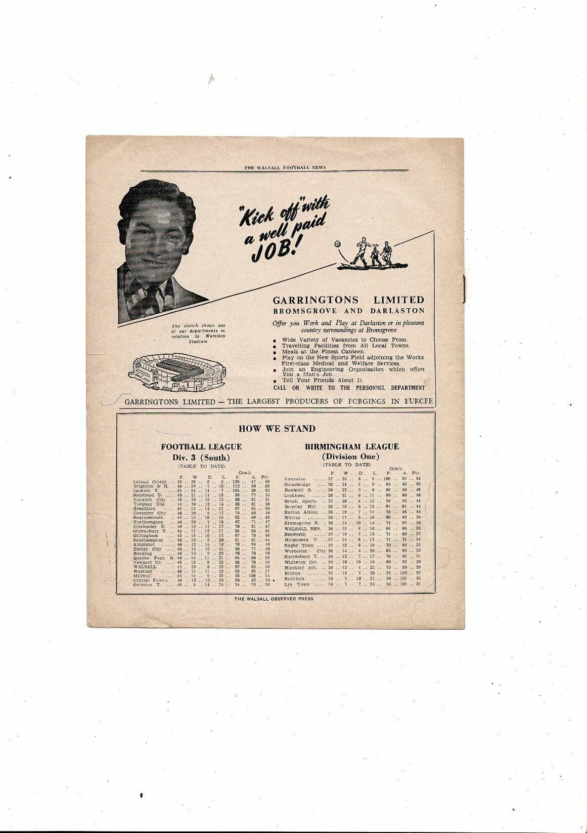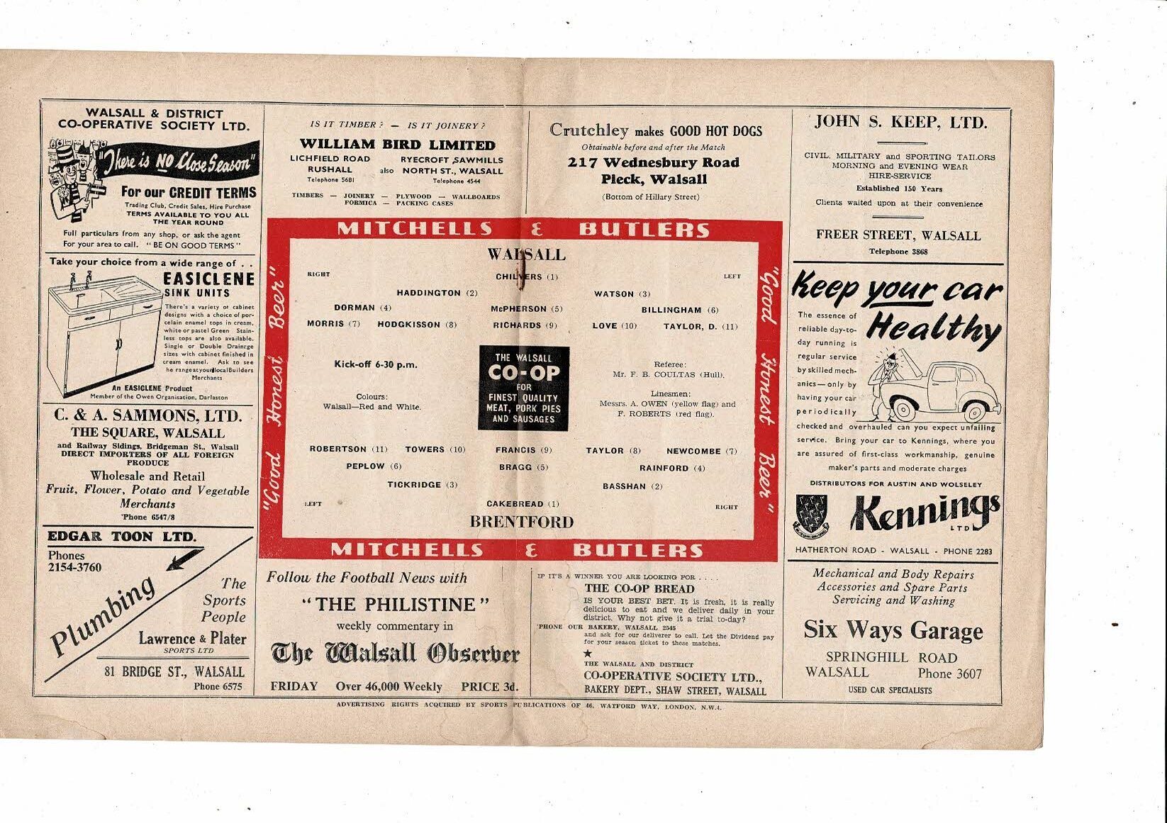 1955/56 Walsall v Brentford Football Programme