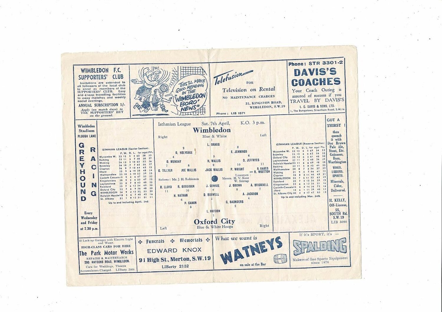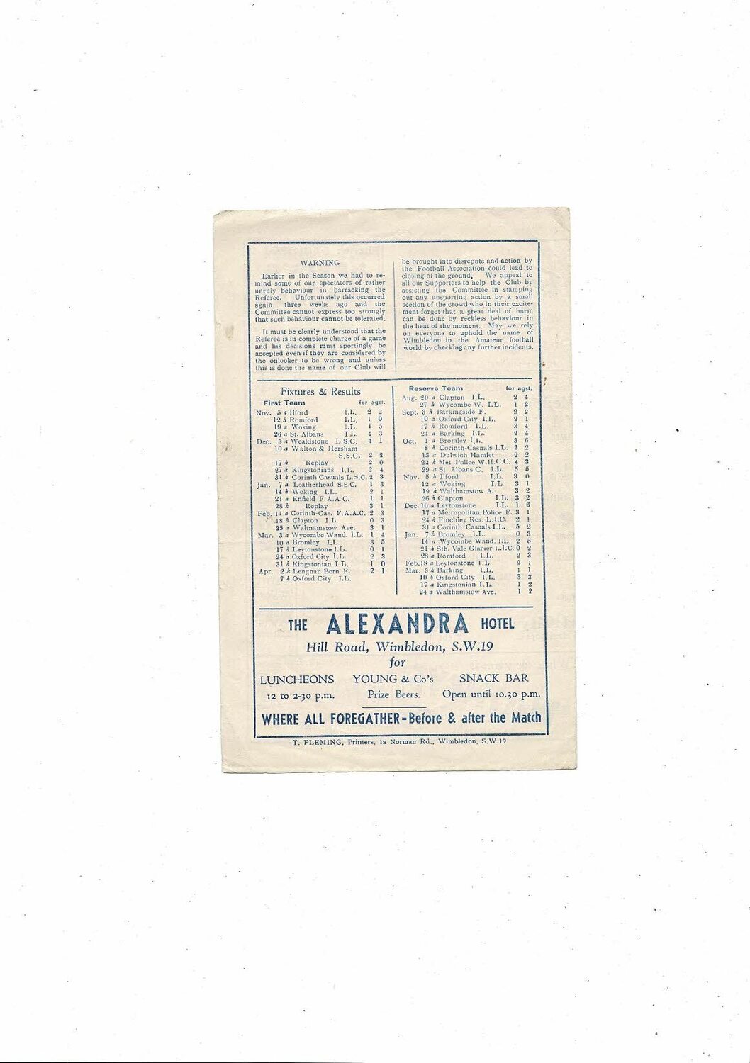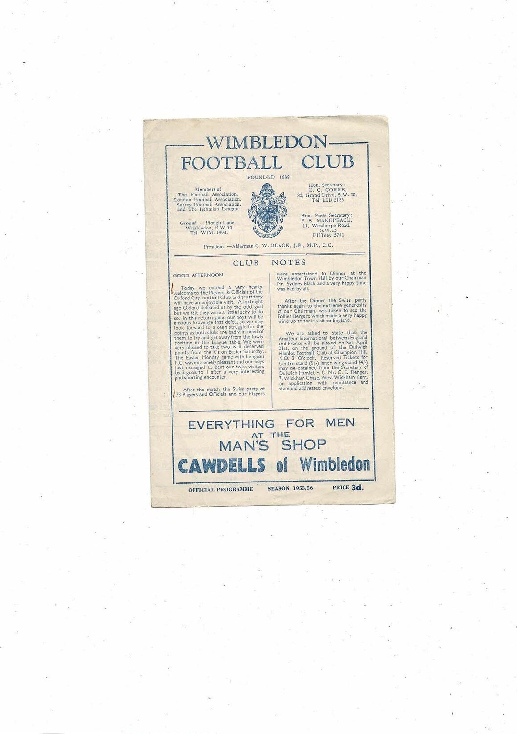 1955/56 Wimbledon v Oxford City Isthmian League Football Programme