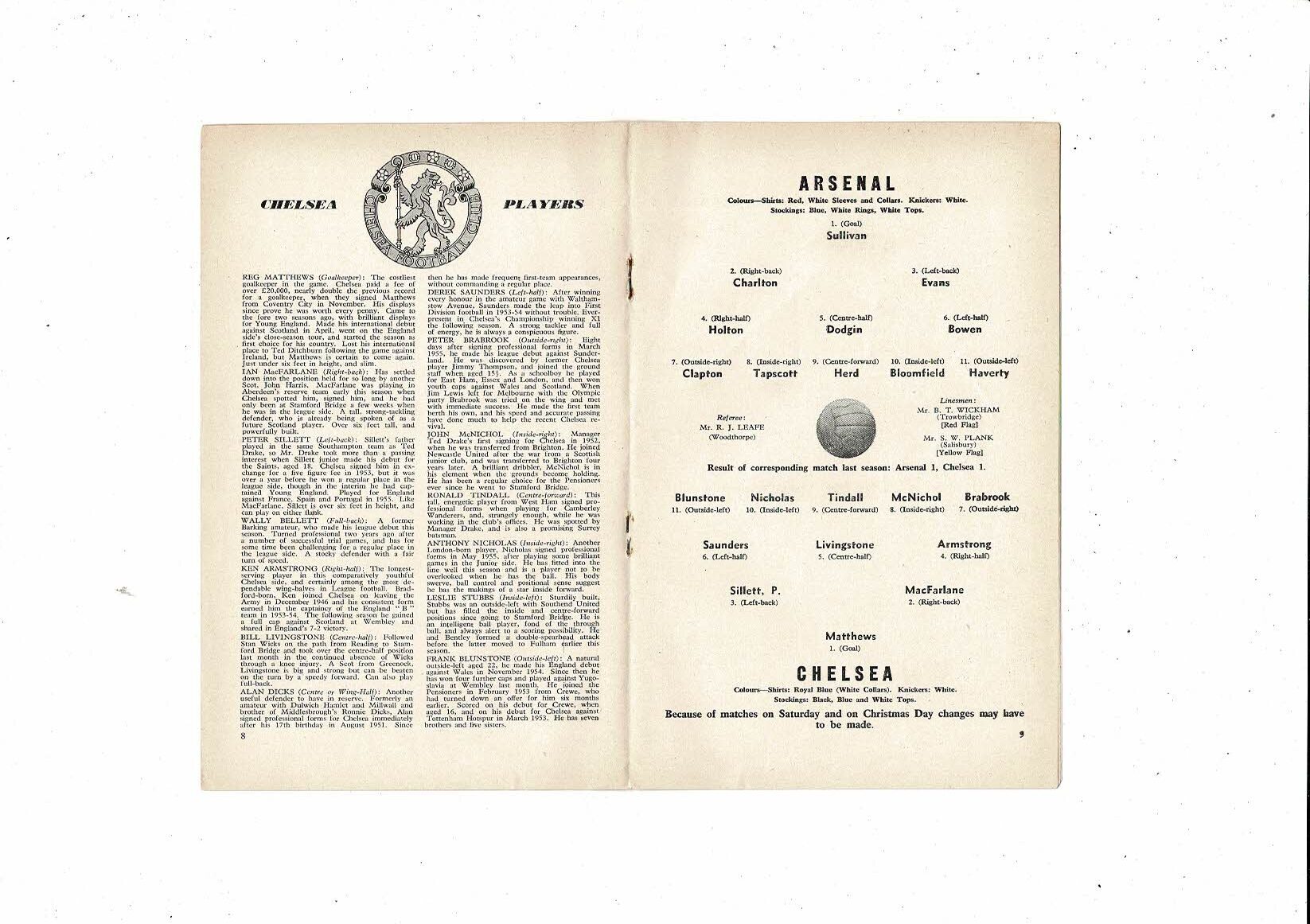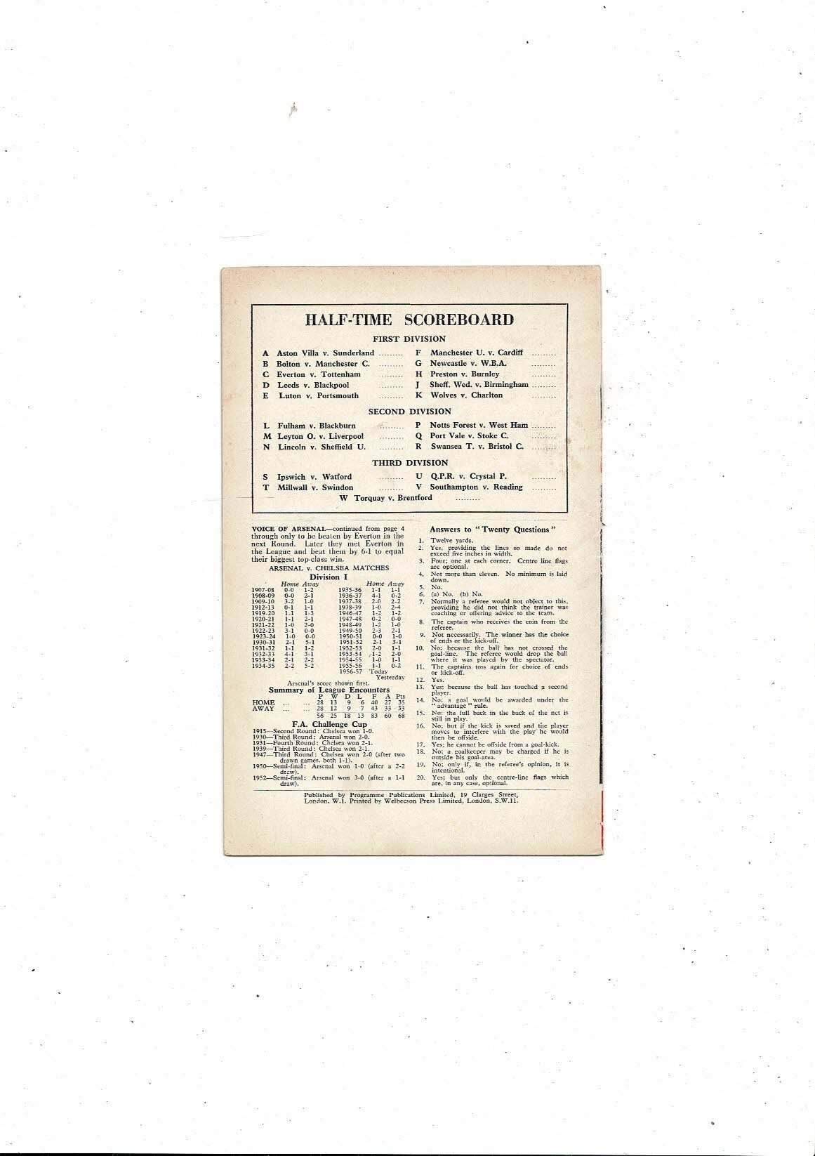 1956/57 Arsenal v Chelsea Football Programme