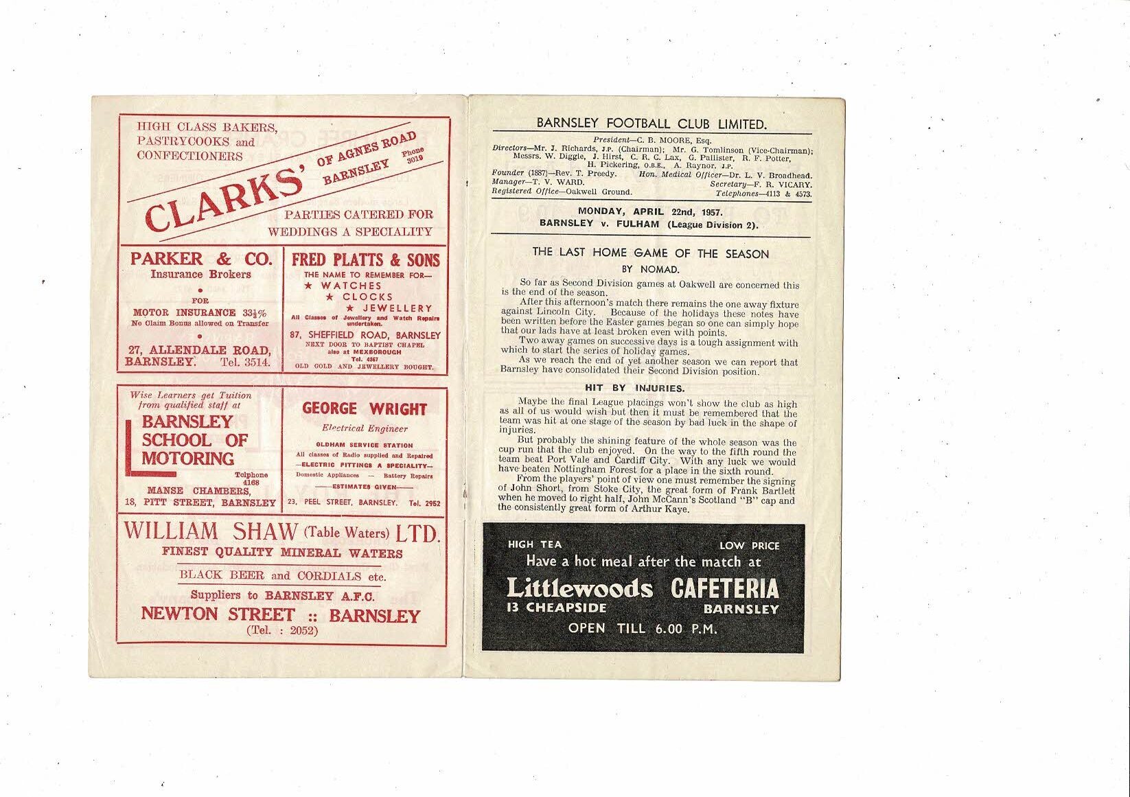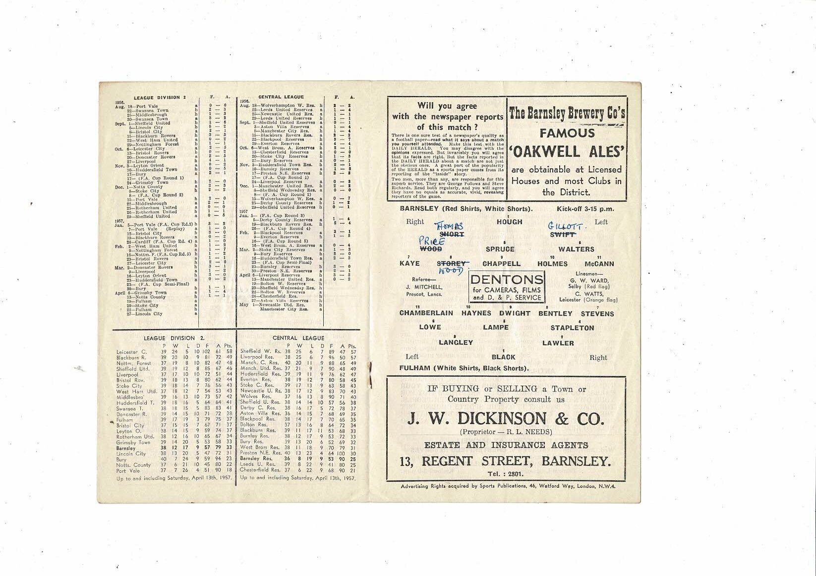 1956/57 Barnsley v Fulham Football Programme