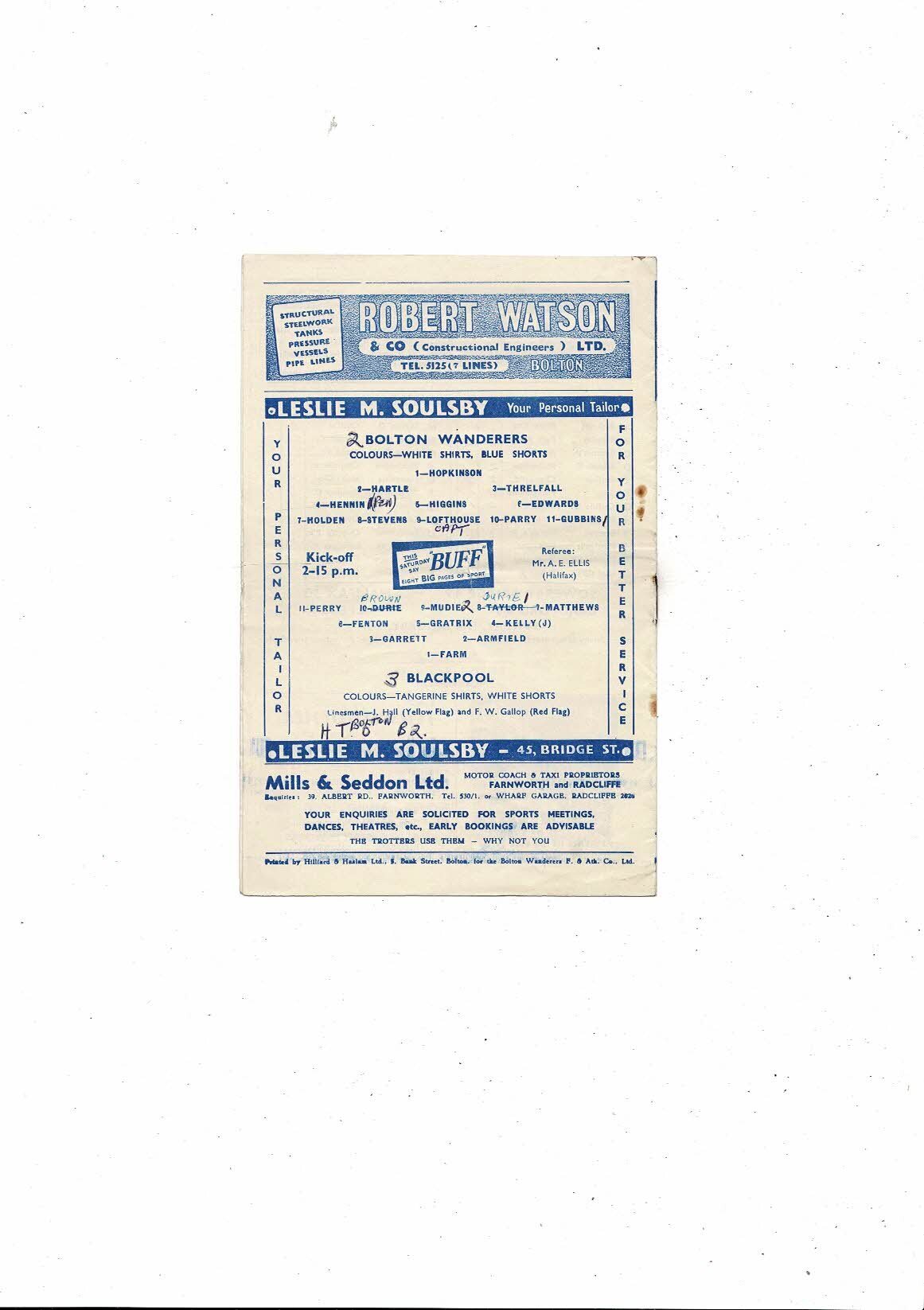 This Original Football Programme is creased also has a fold with some staining, rusty staple, tear on center fold throughout, score, scorers, team changes & some results noted. Please see scans.