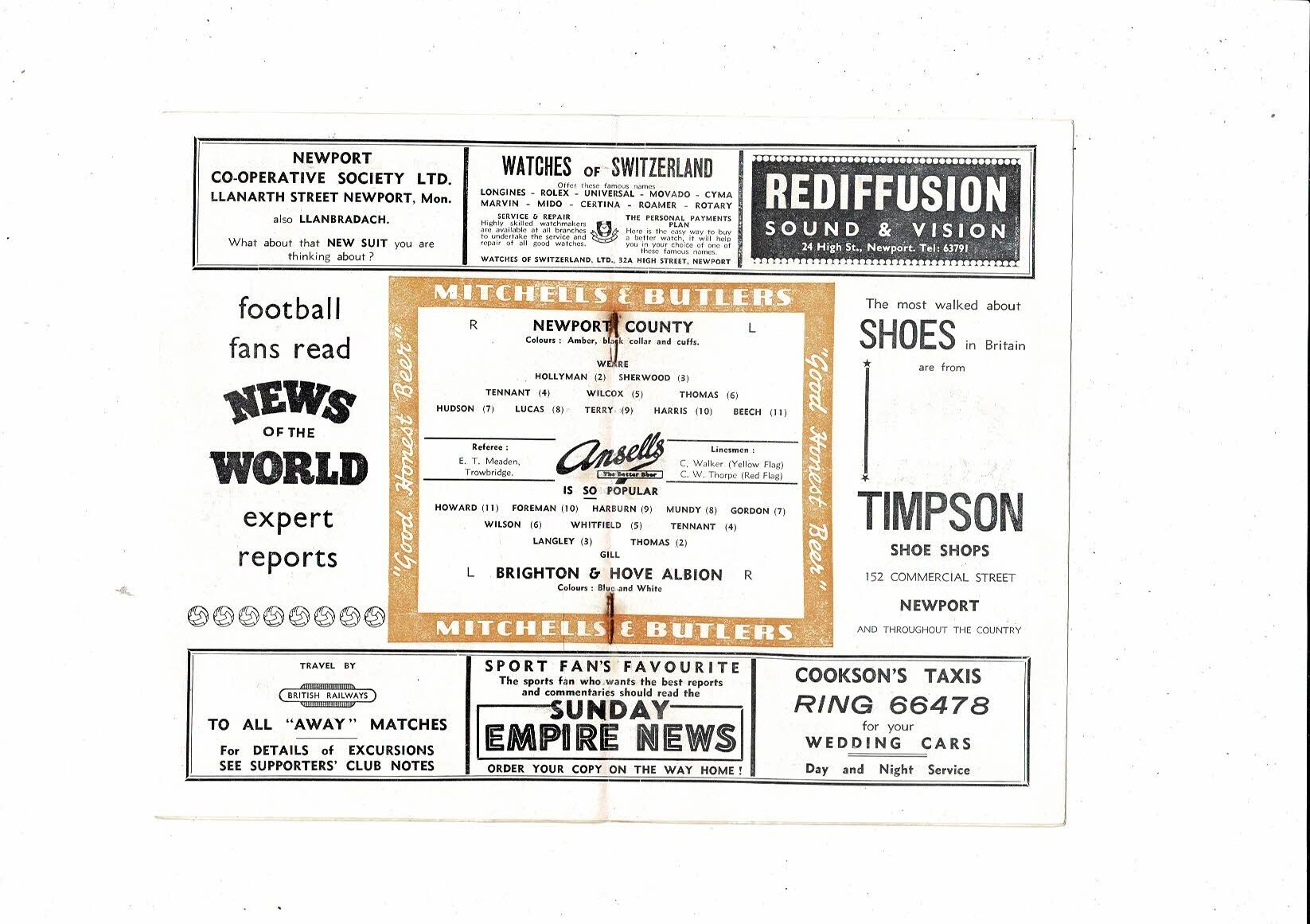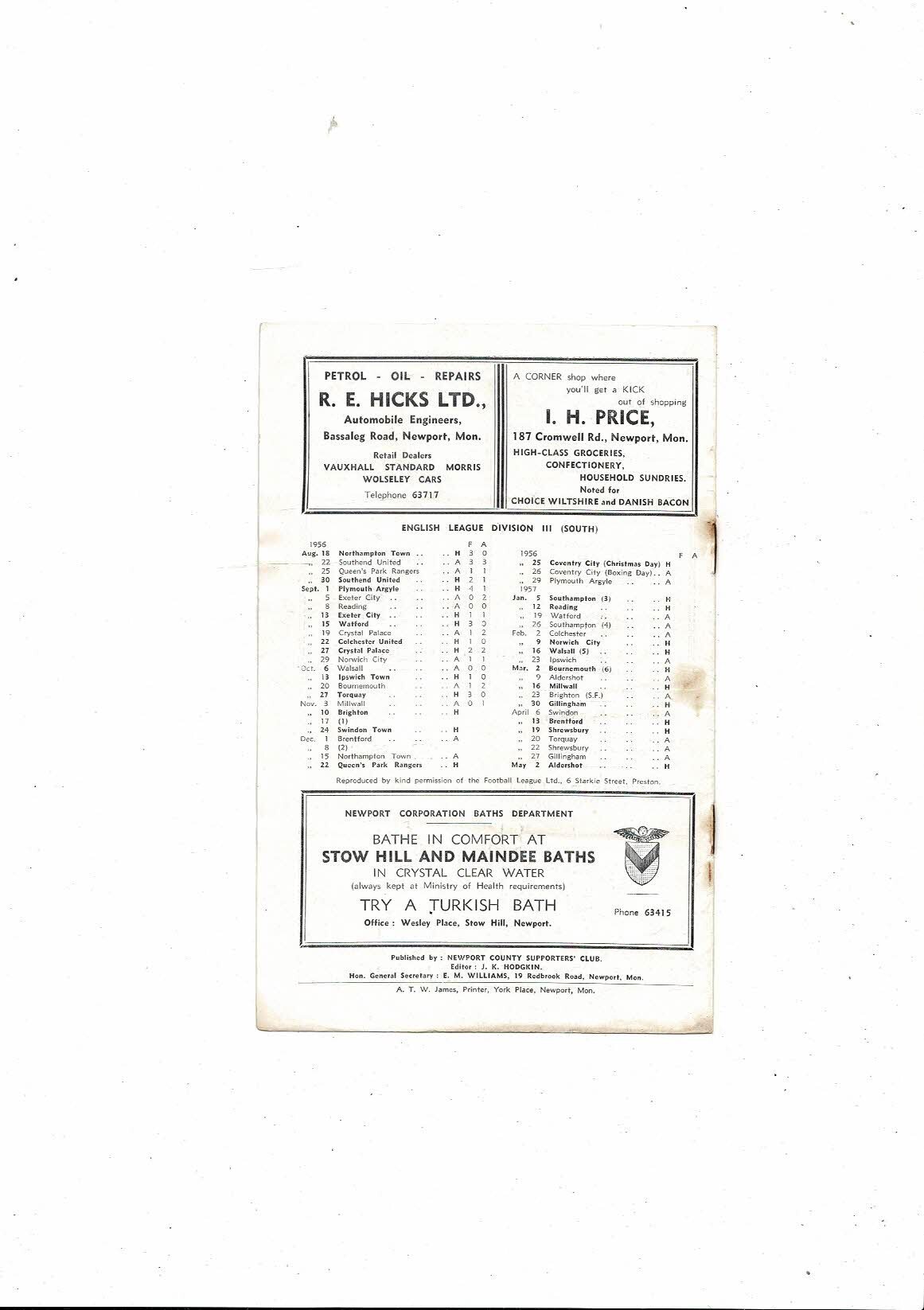 1956/57 Newport County v Brighton Football Programme