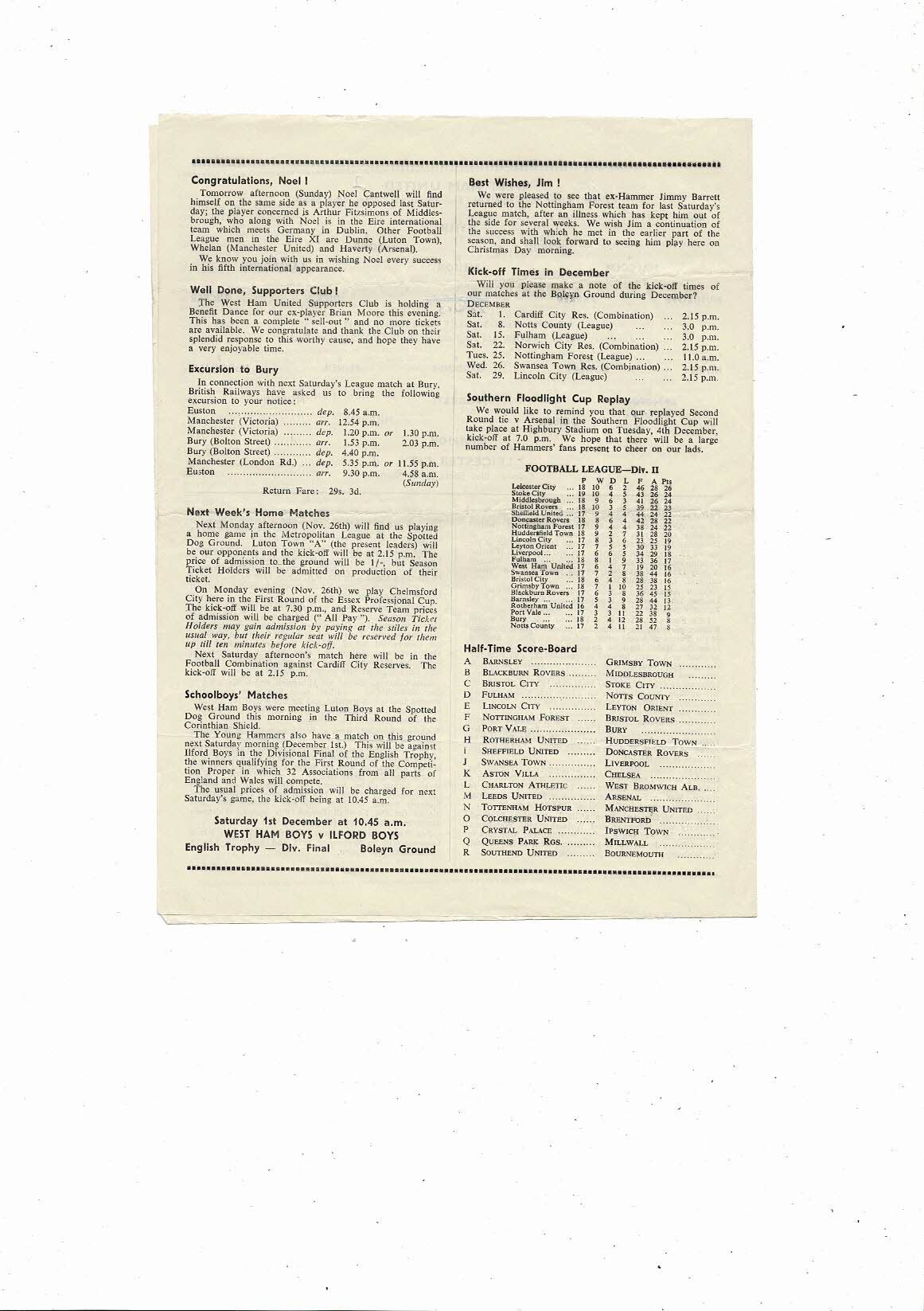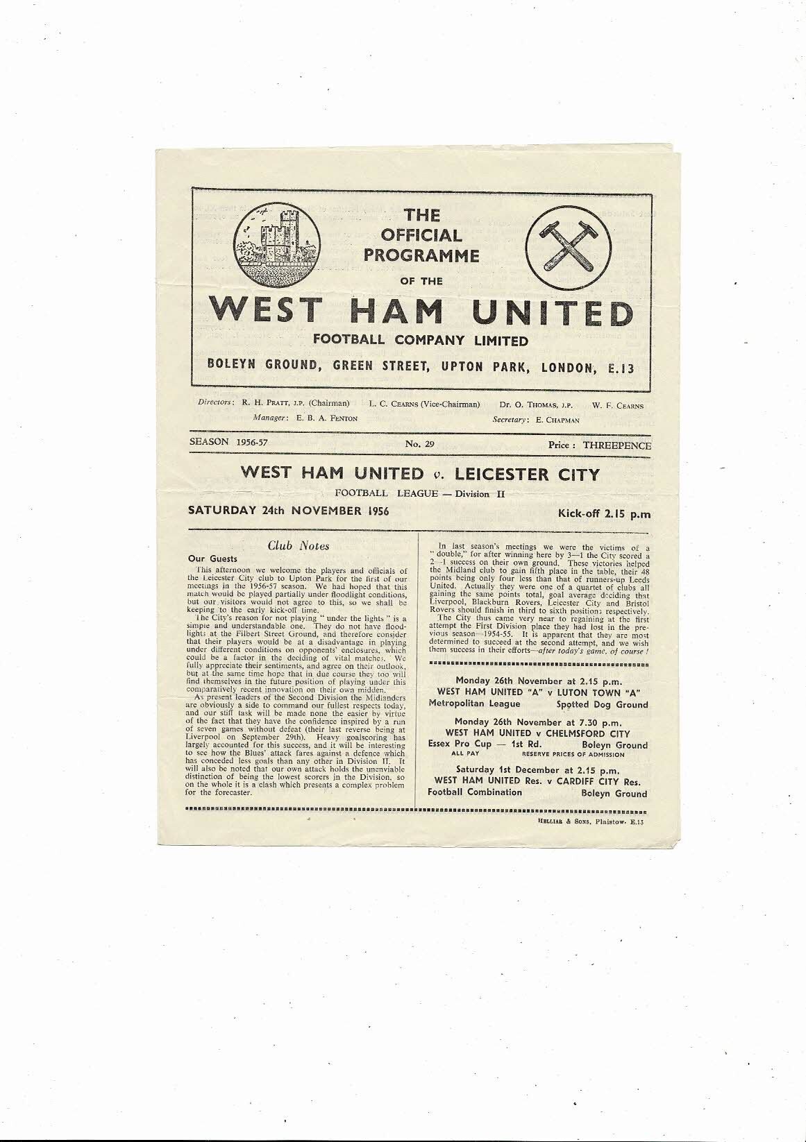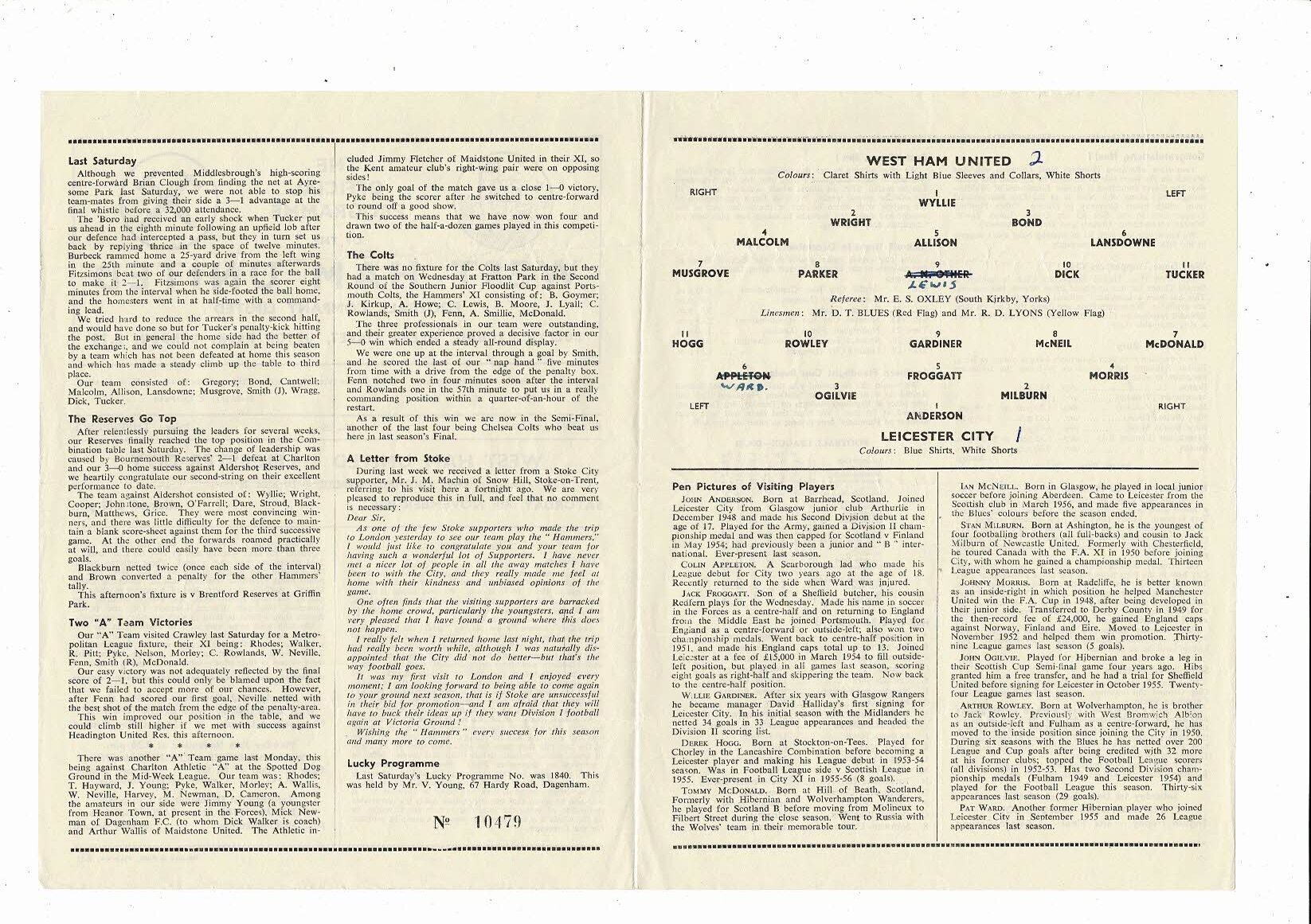 1956/57 West Ham United v Leicester City Football Programme