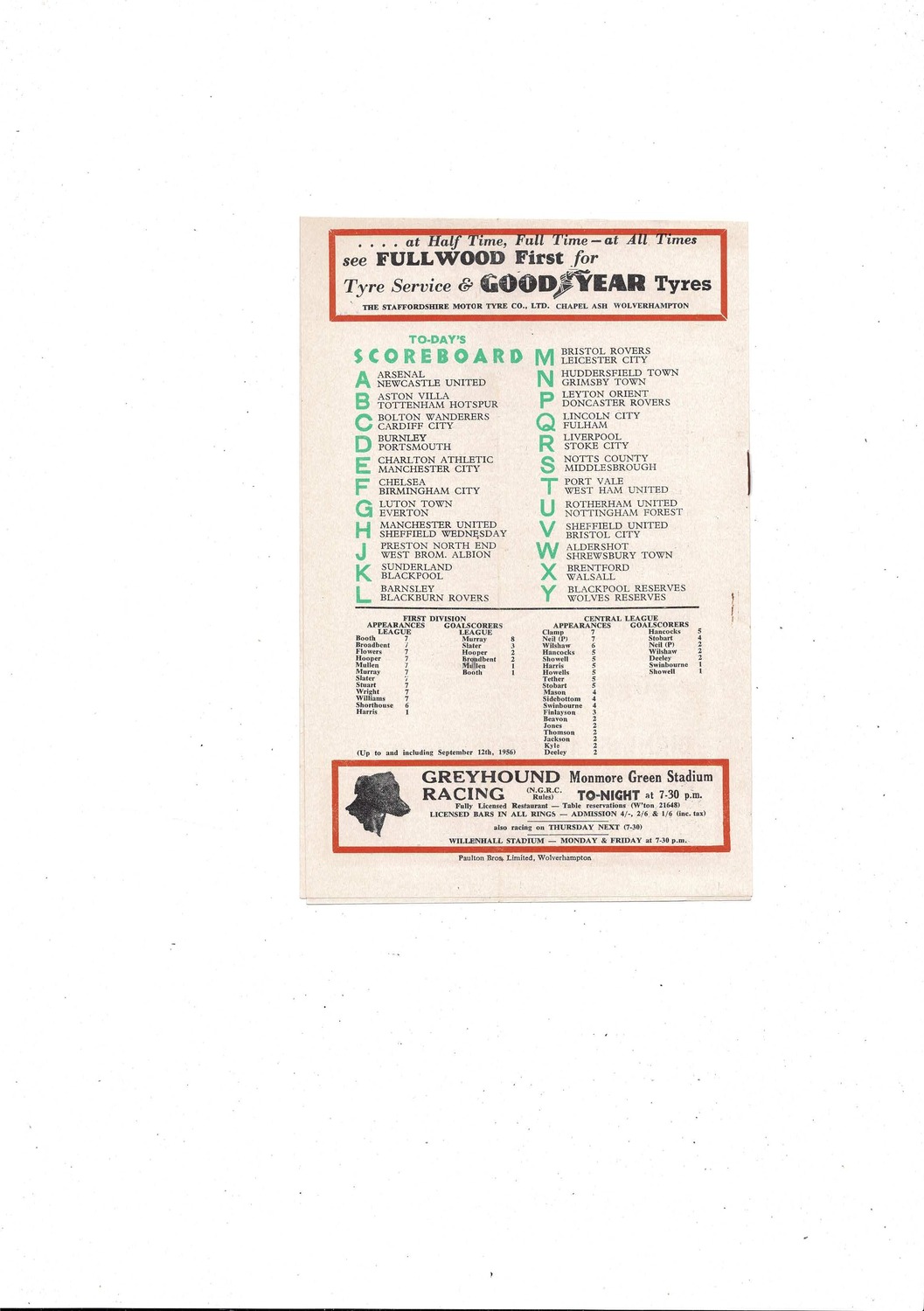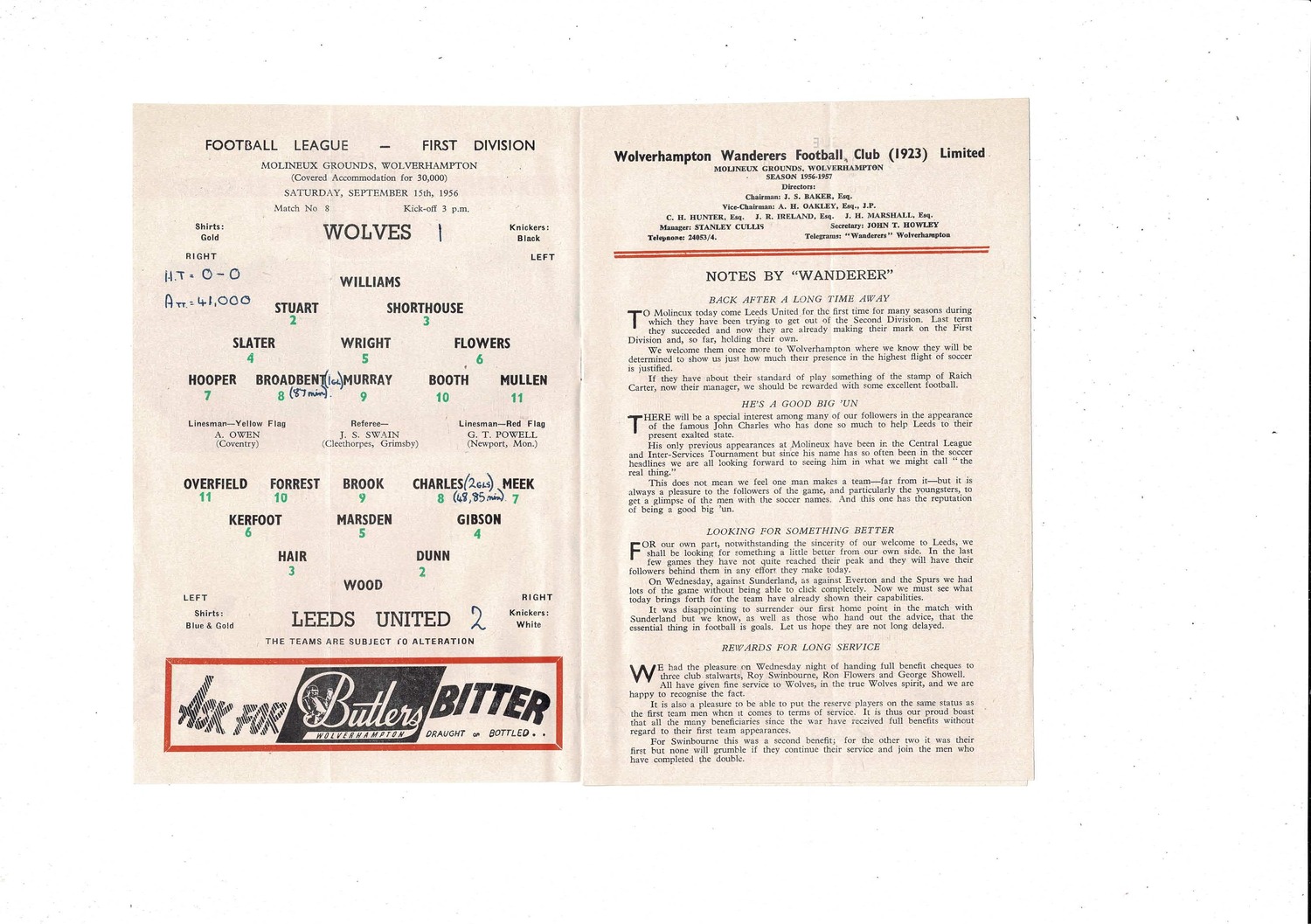 1956/57 Wolves v Leeds United Football Programme