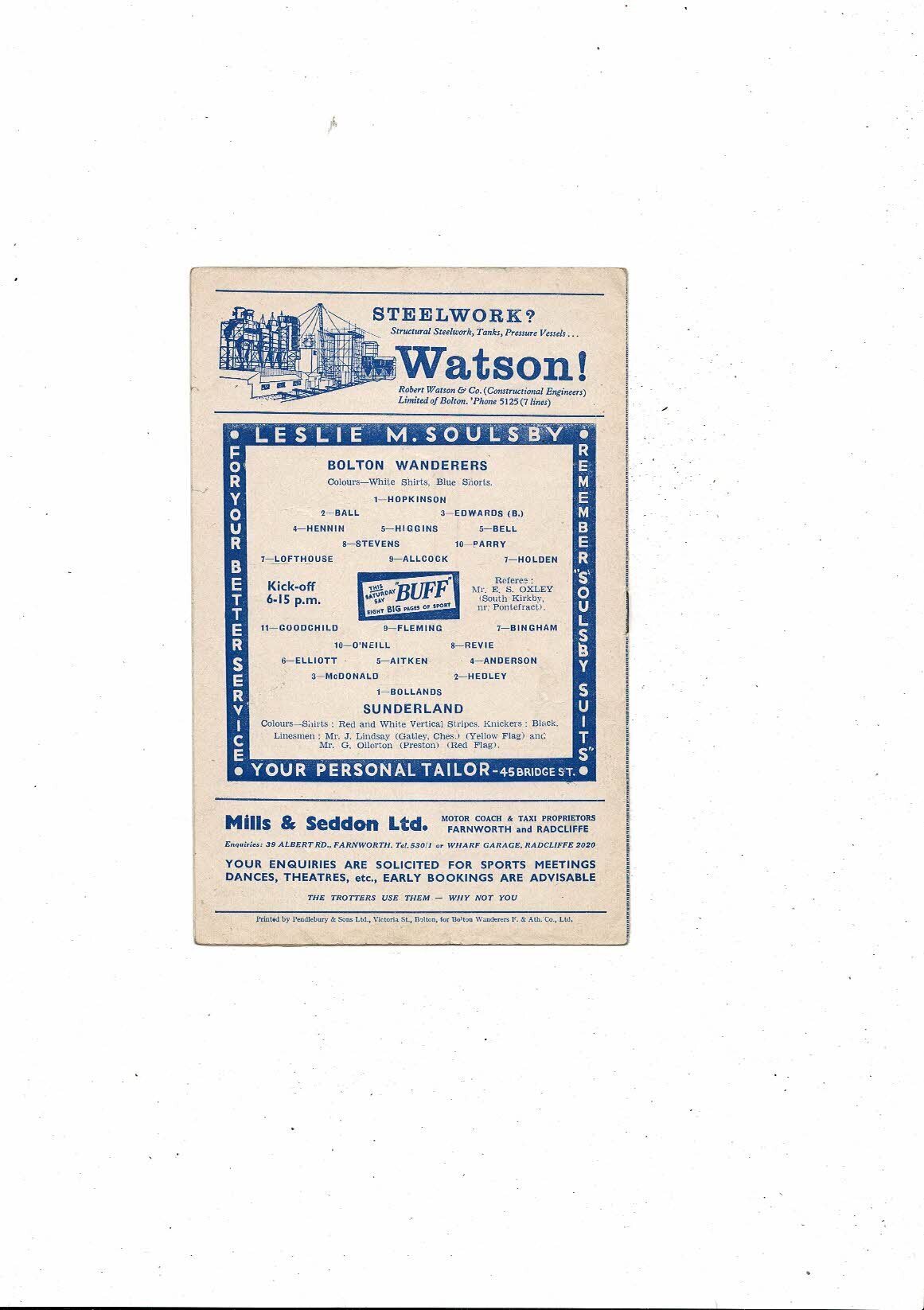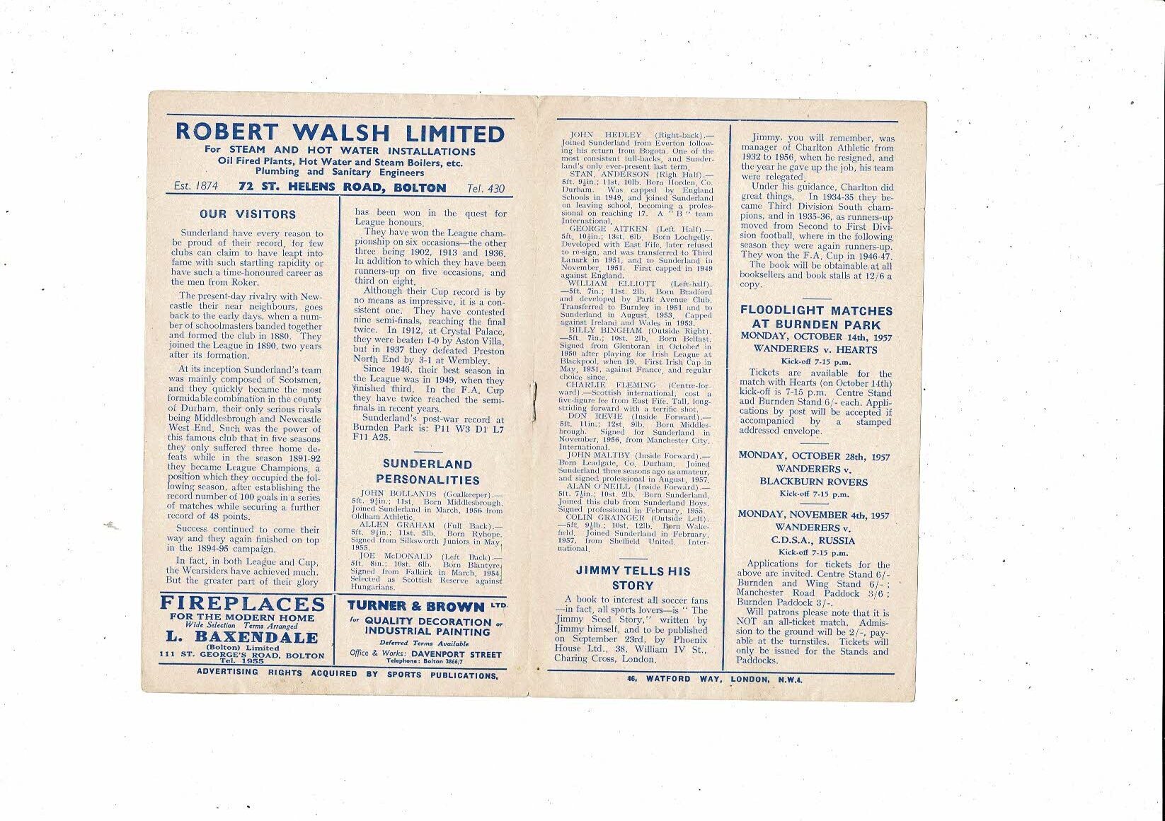 1957/58 Bolton Wanderers v Sunderland Football Programme