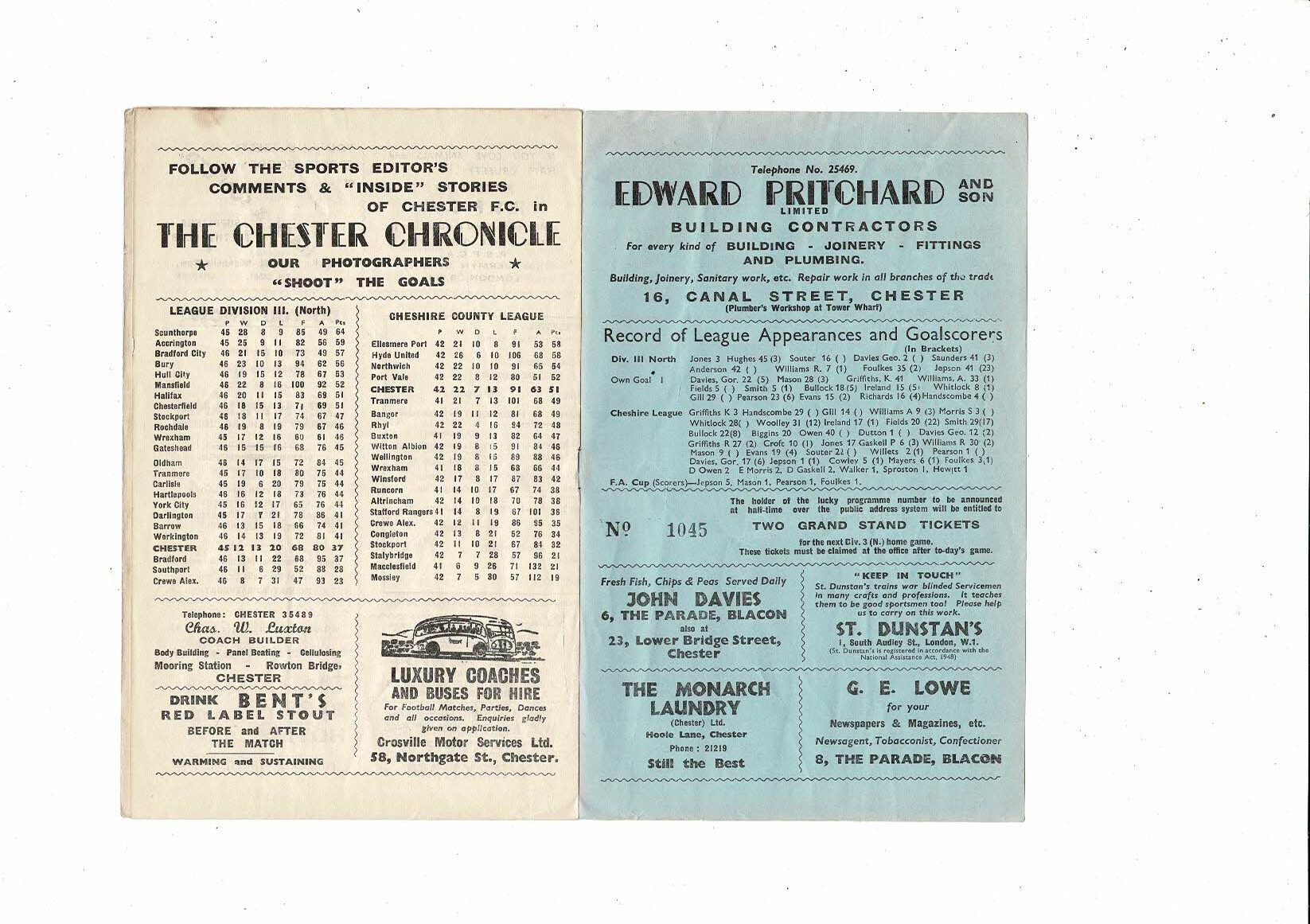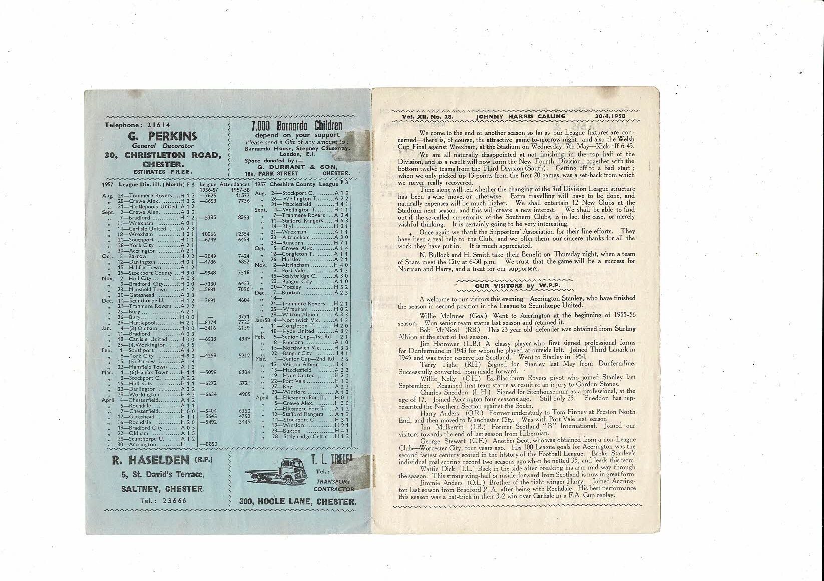 1957/58 Chester v Accrington Stanley Football Programme. April