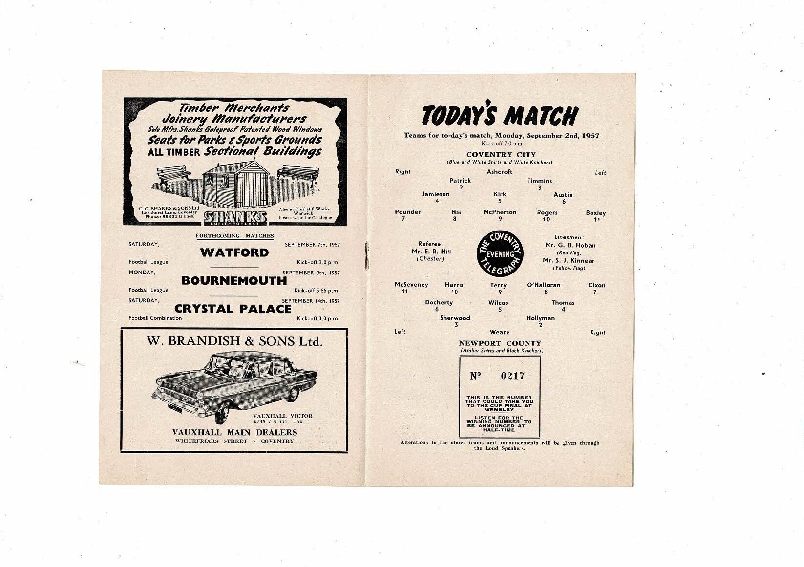1957/58 Coventry City v Newport County Football Programme