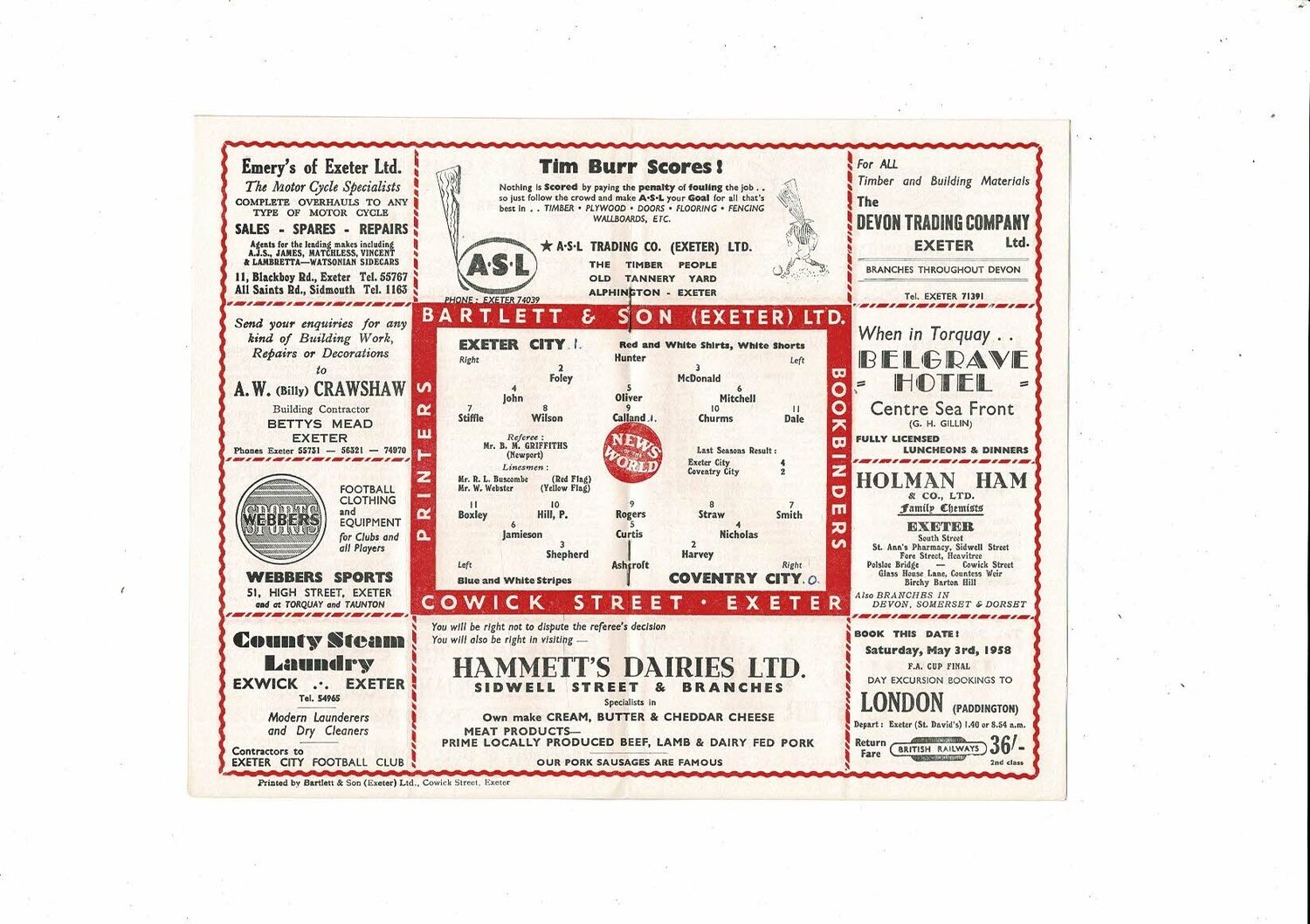 1957/58 Exeter City v Coventry City Football Programme