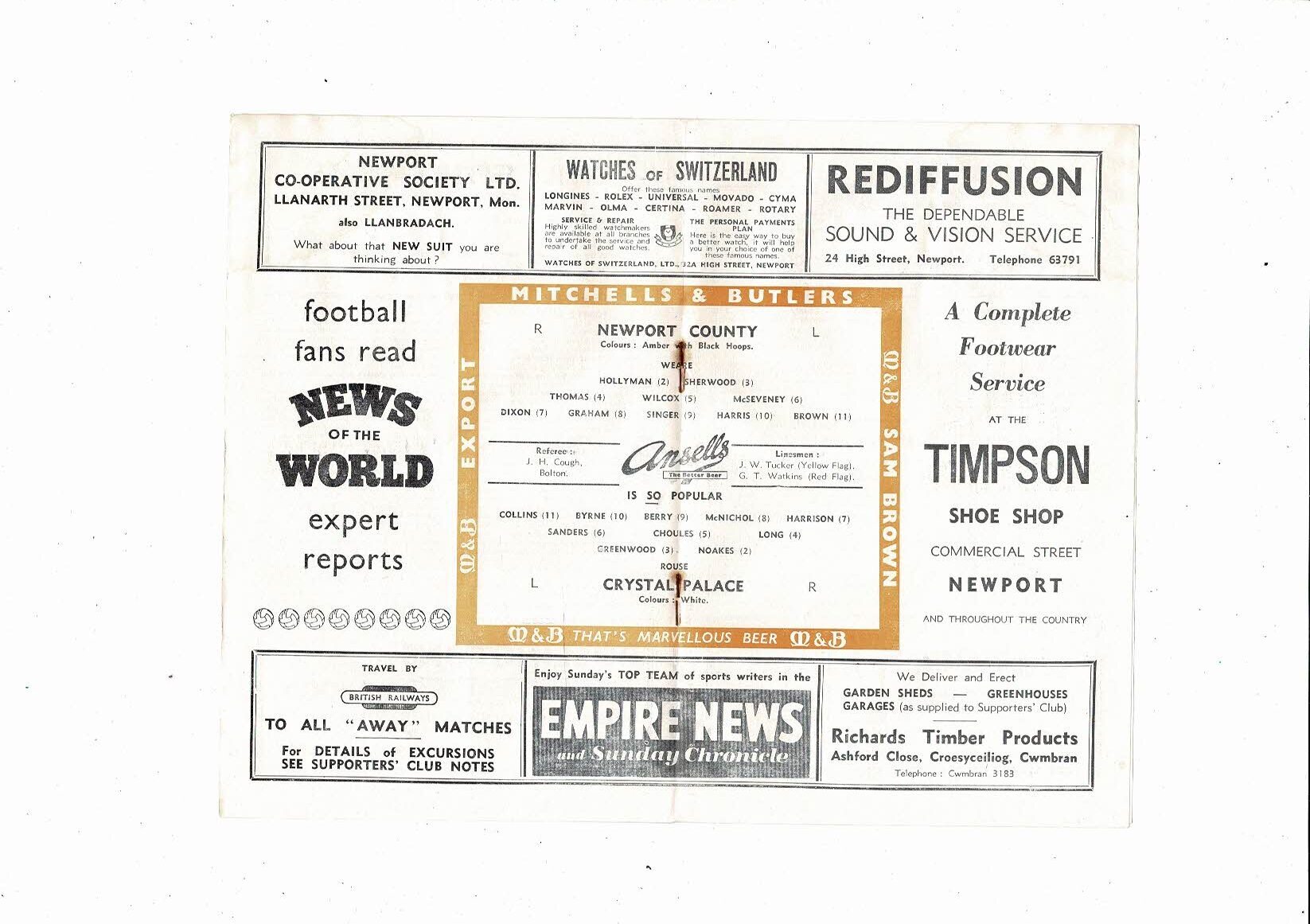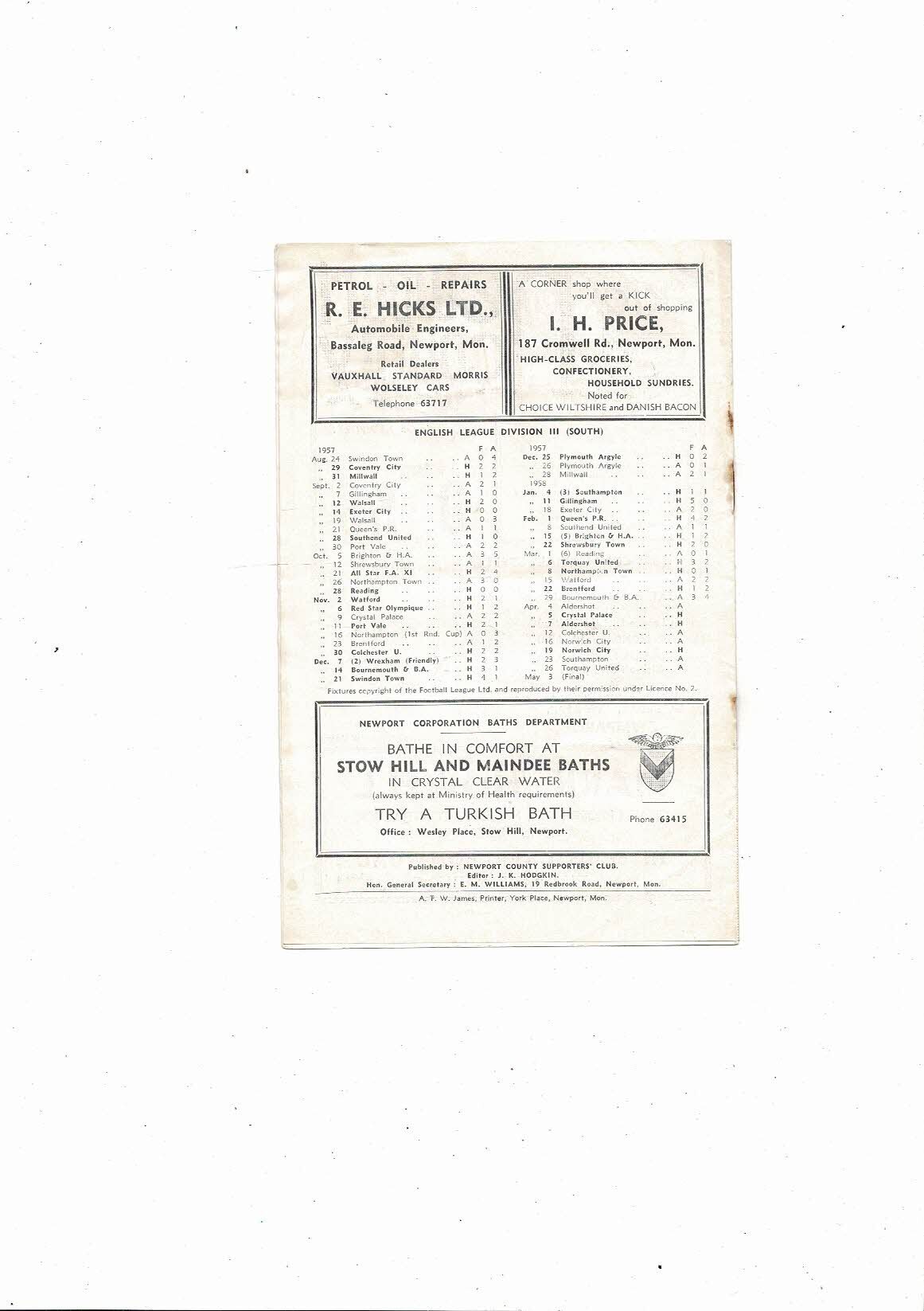 1957/58 Newport County v Crystal Palace Football Programme