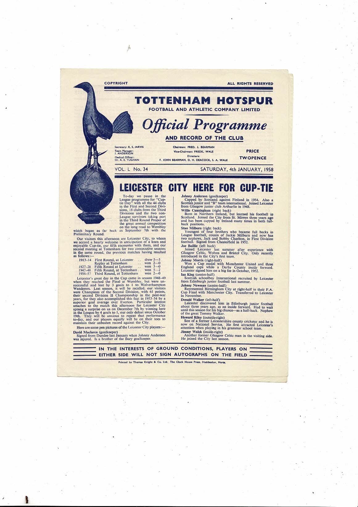 1957/58 Tottenham Hotspur v Leicester City FA Cup Football Programme