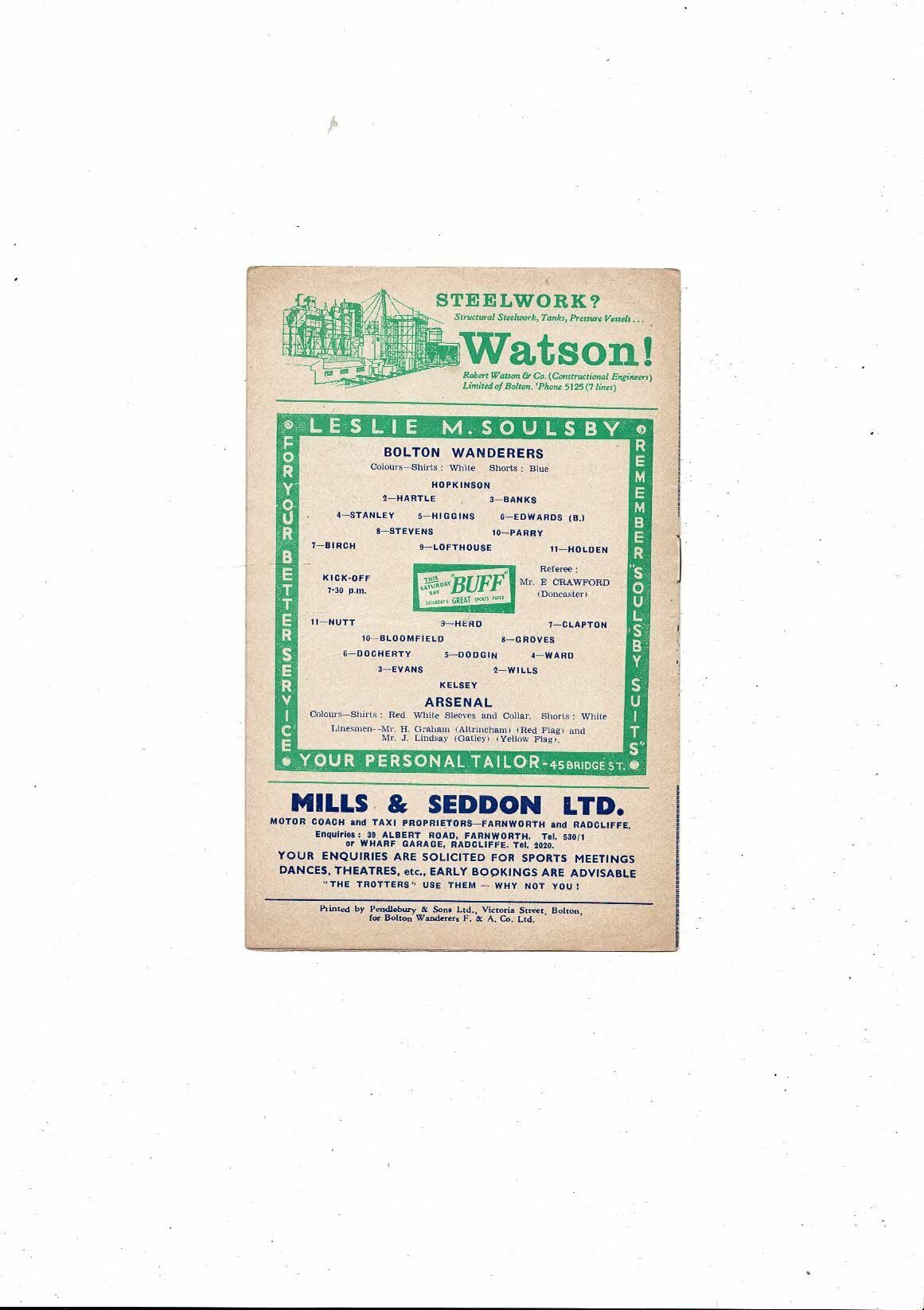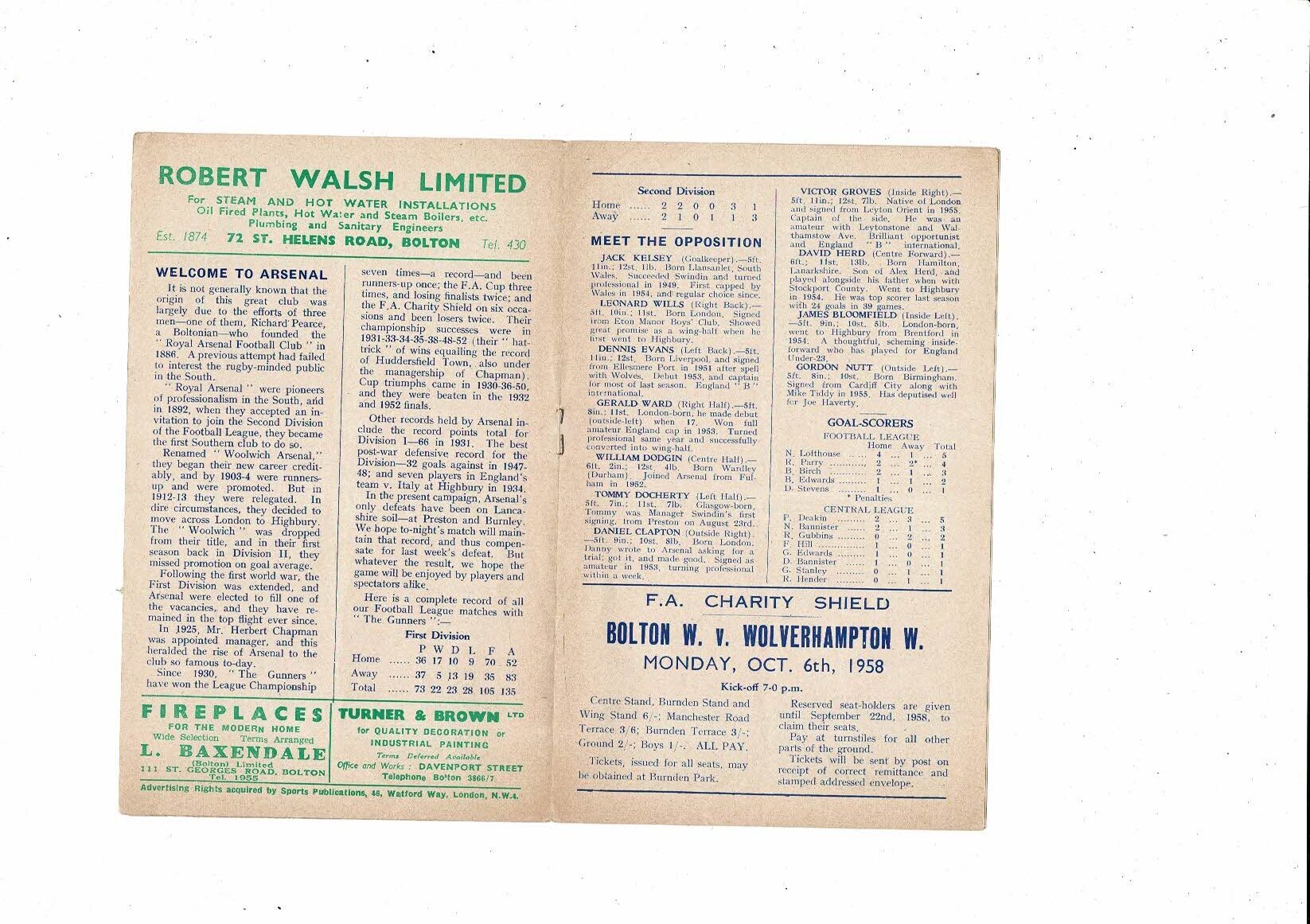 1958/59 Bolton Wanderers v Arsenal Football Programme