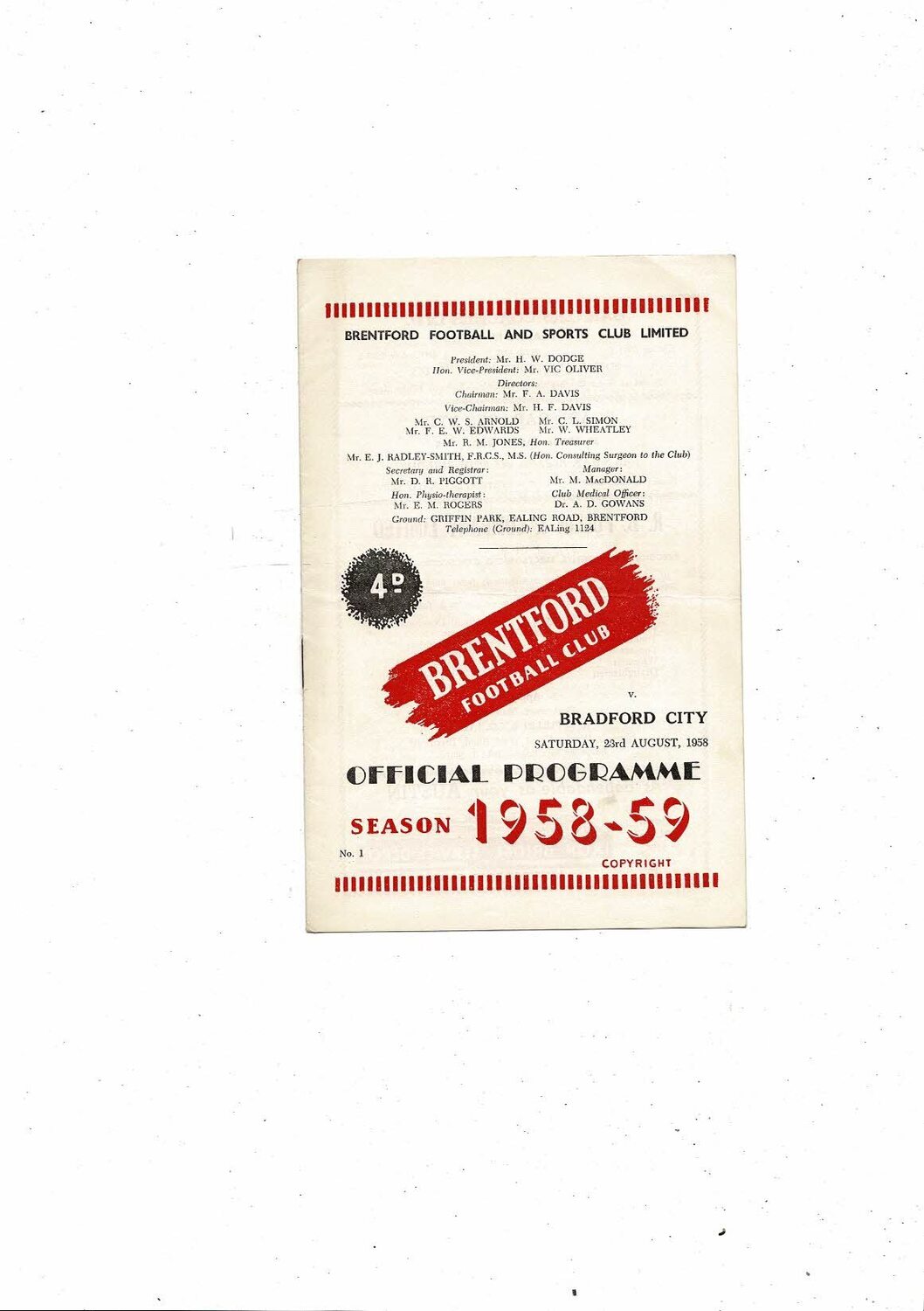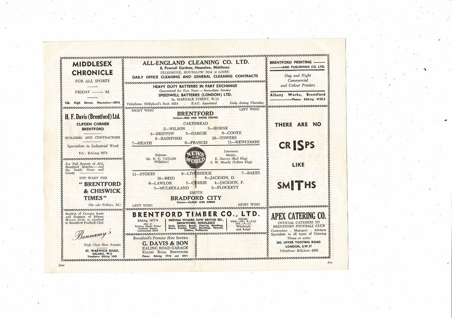 1958/59 Brentford v Bradford City Football Programme