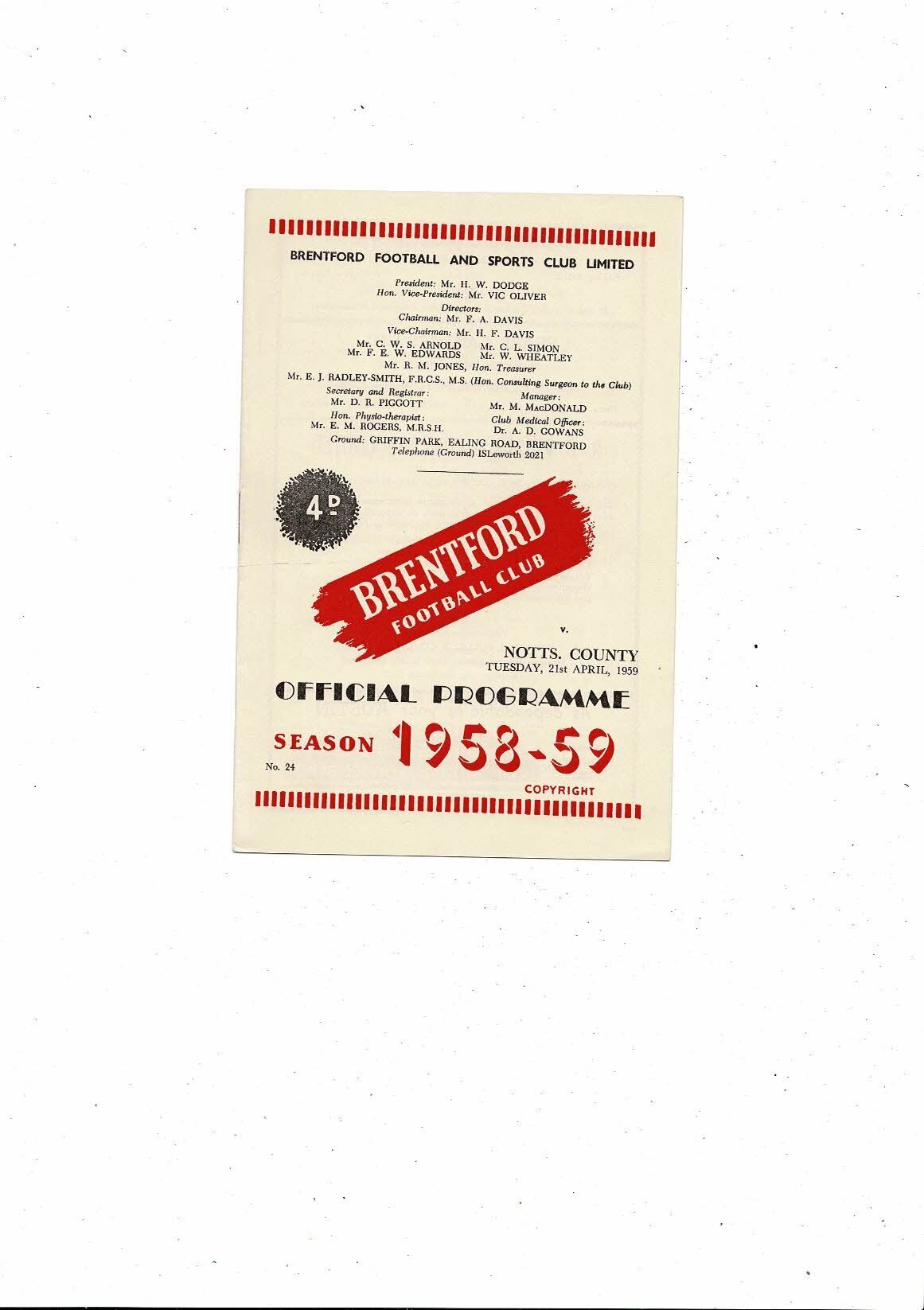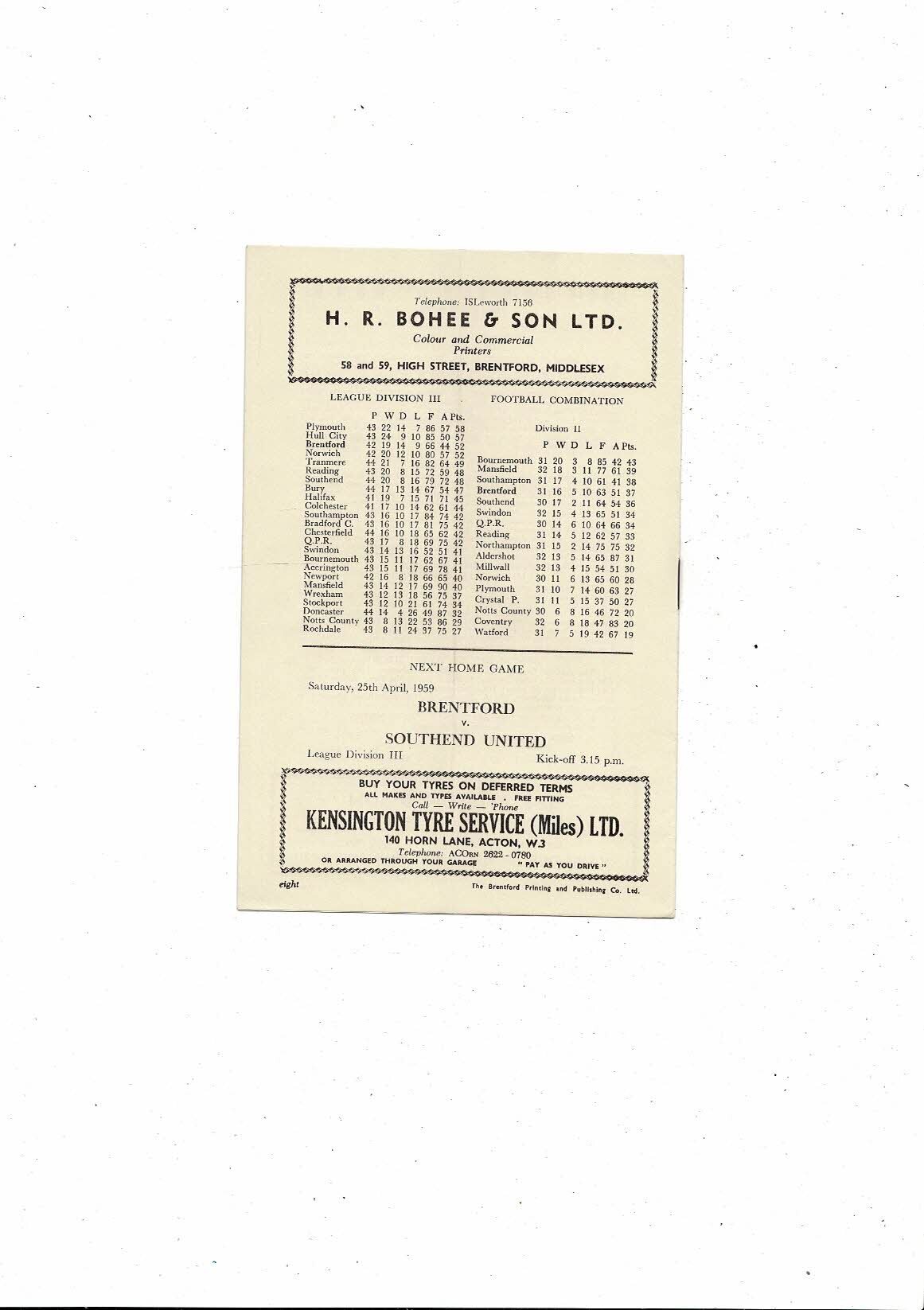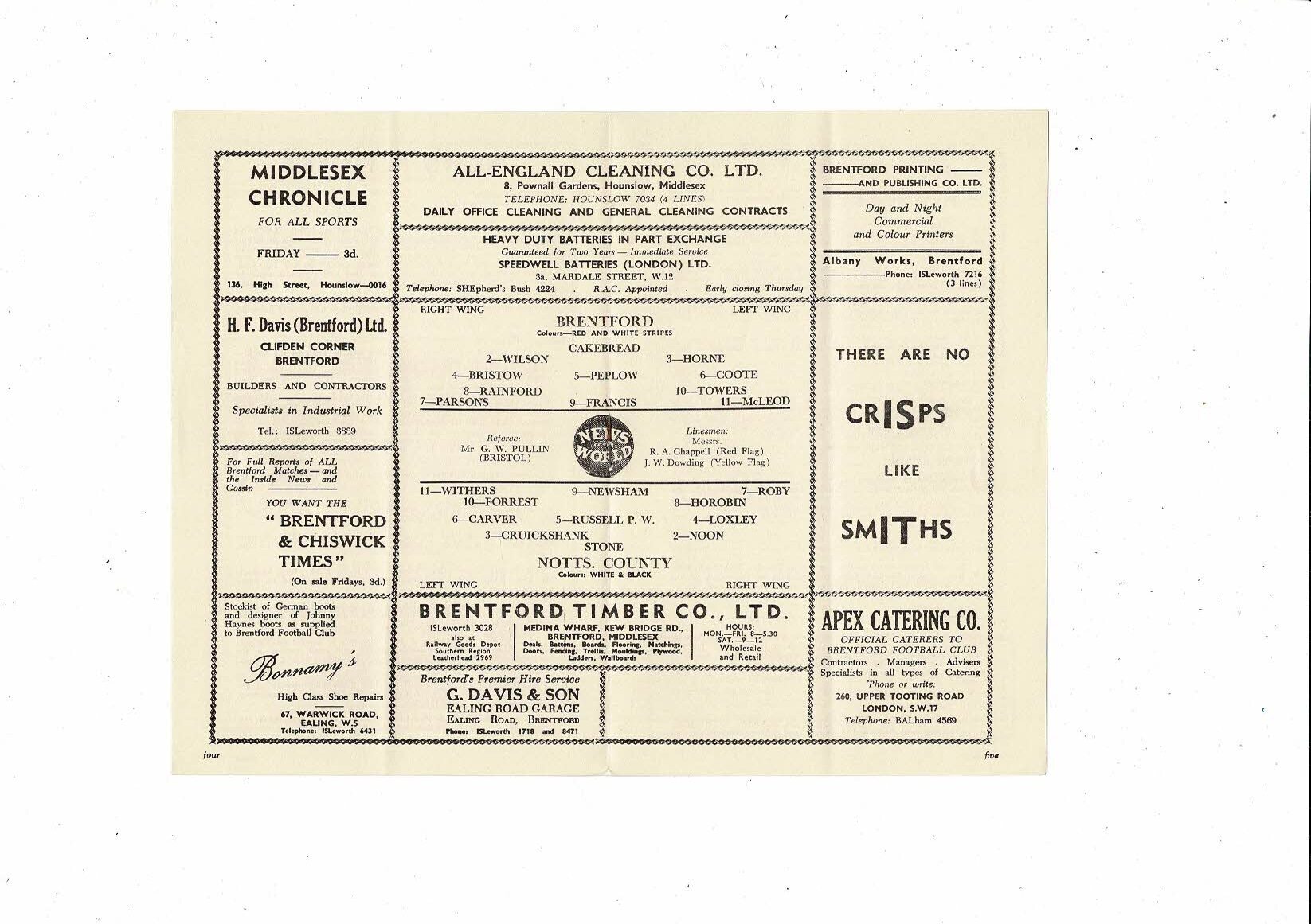 1958/59 Brentford v Notts County Football Programme