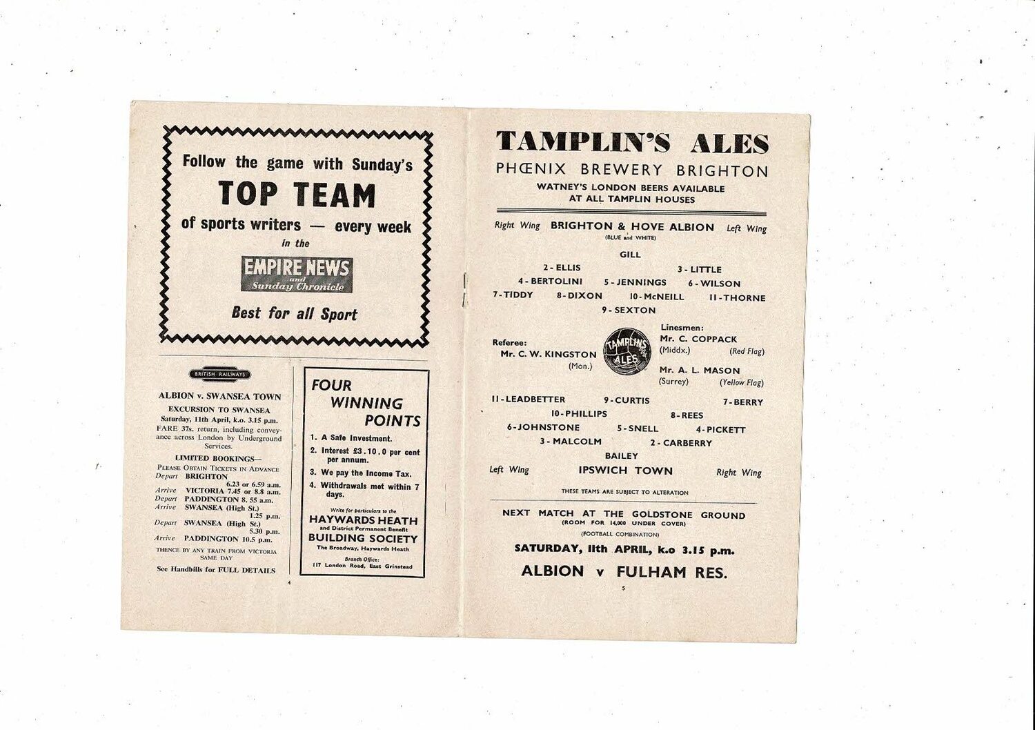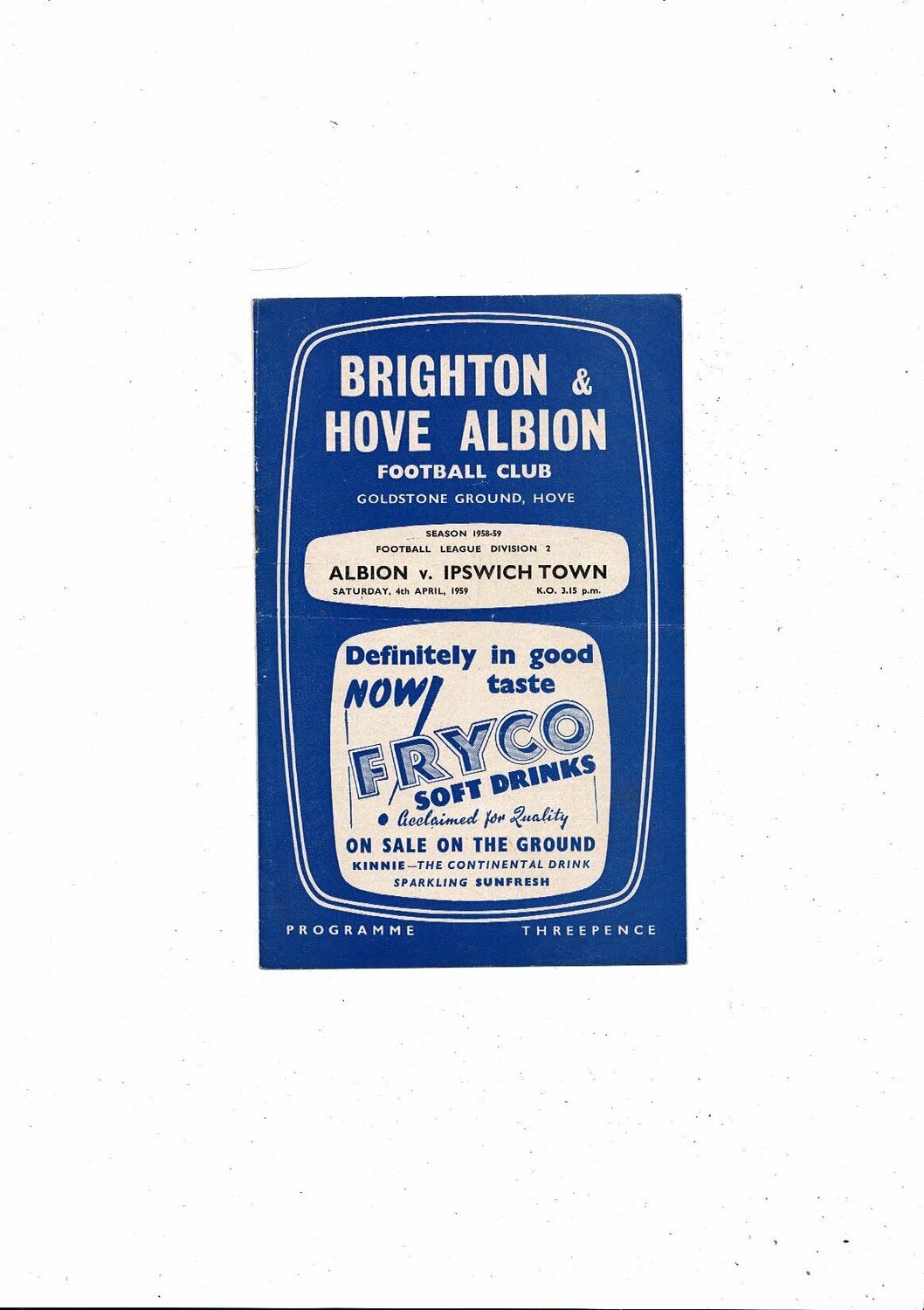 1958/59 Brighton v Ipswich Town Football Programme
