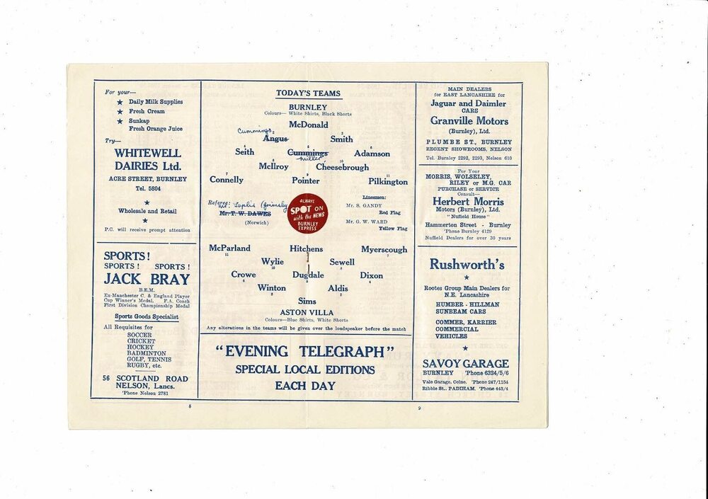 1958/59 Burnley v Aston Villa FA Cup Sixth Round Replay Football Programme