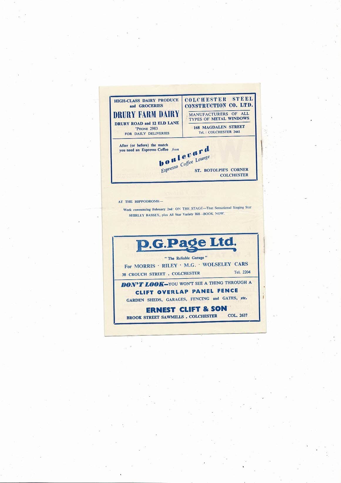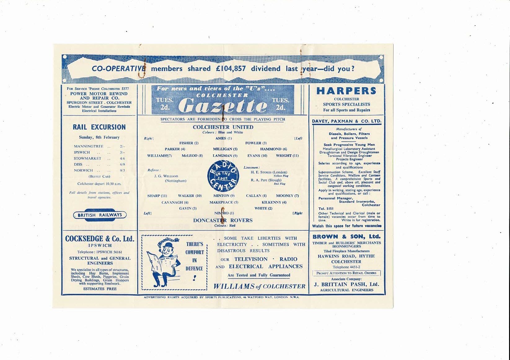 1958/59 Colchester United v Doncaster Rovers Football Programme