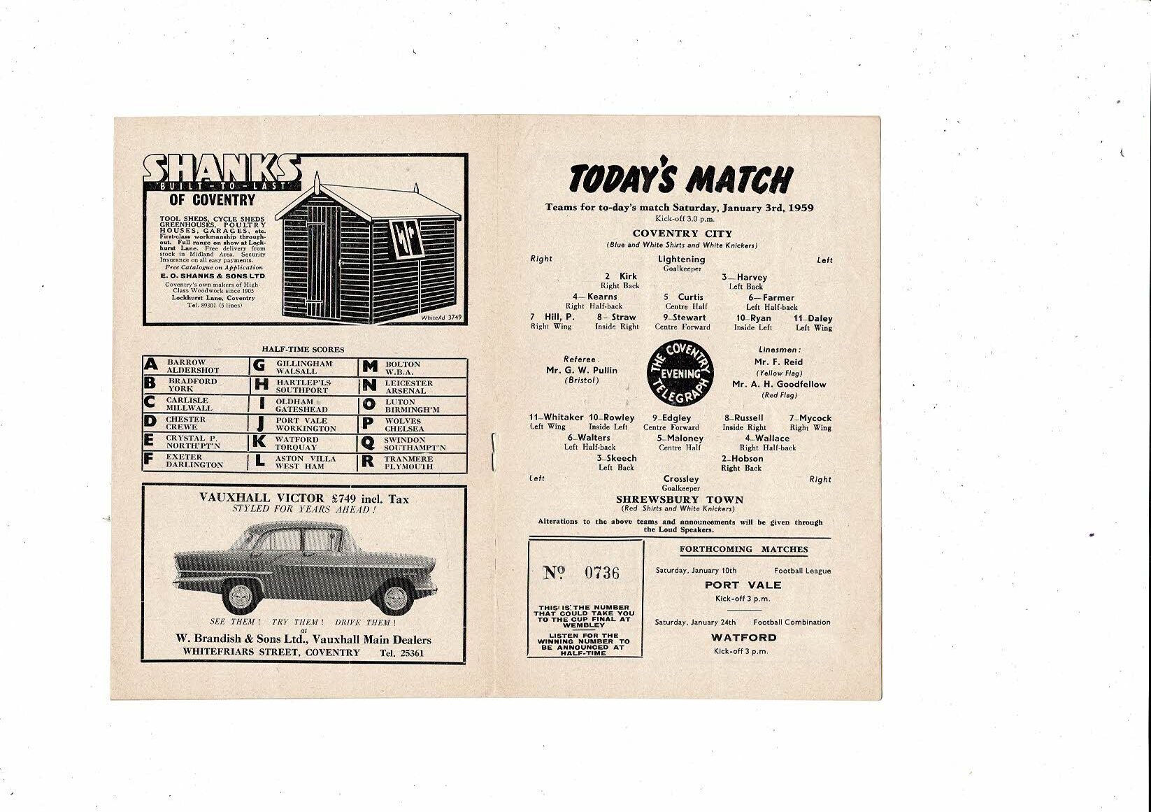 1958/59 Coventry City v Shrewsbury Town Football Programme