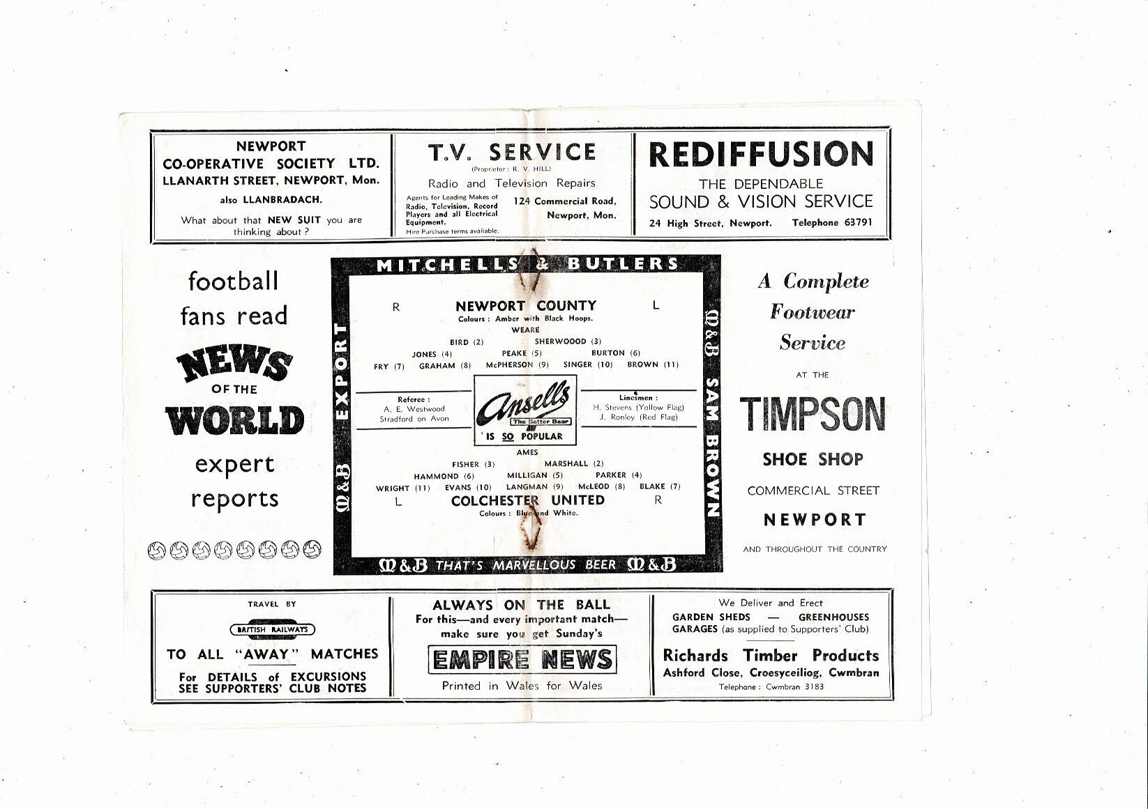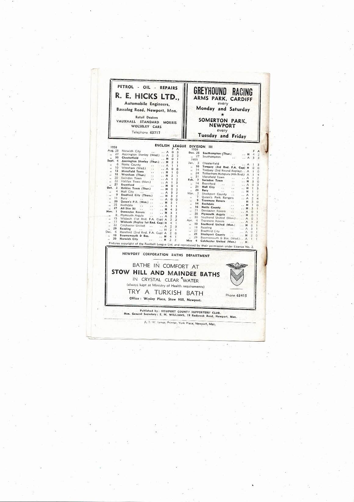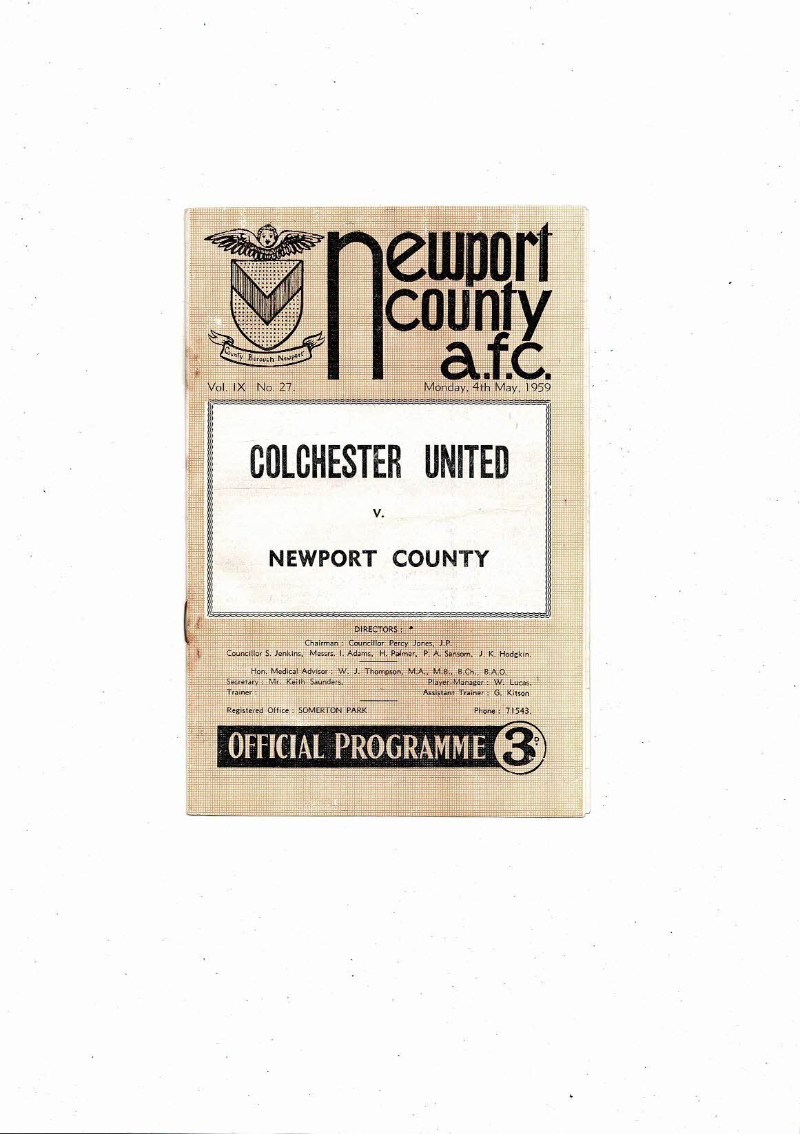 1958/59 Newport County v Colchester United Football Programme