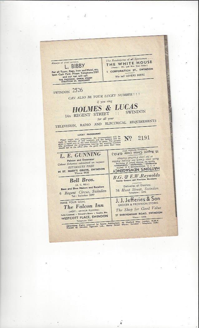 1958/59 Swindon Town v Doncaster Rovers Football Programme
