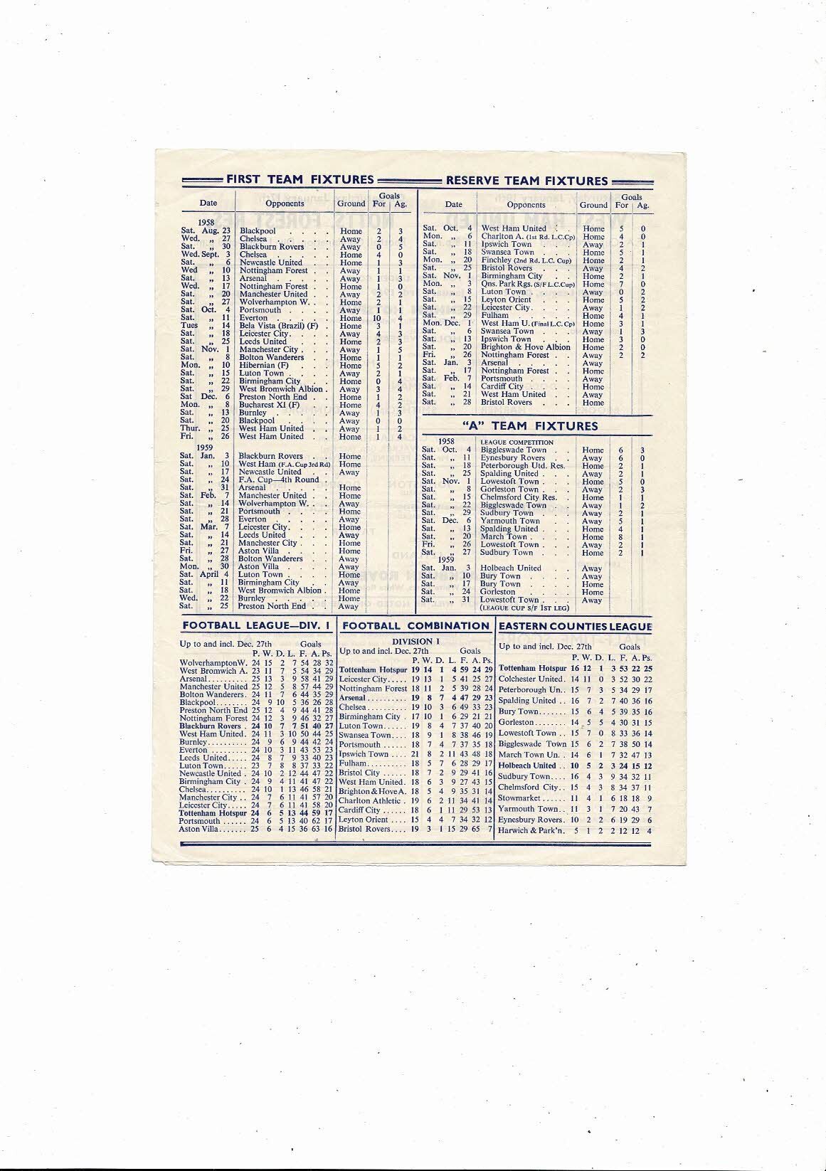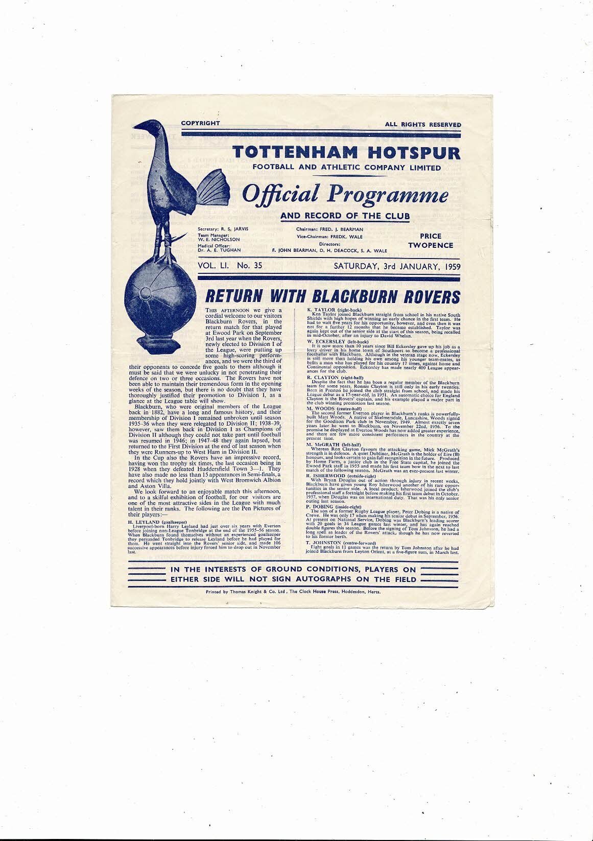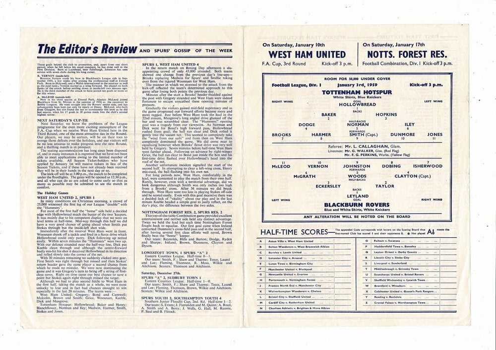 1958/59 Tottenham Hotspur v Blackburn Rovers Football Programme