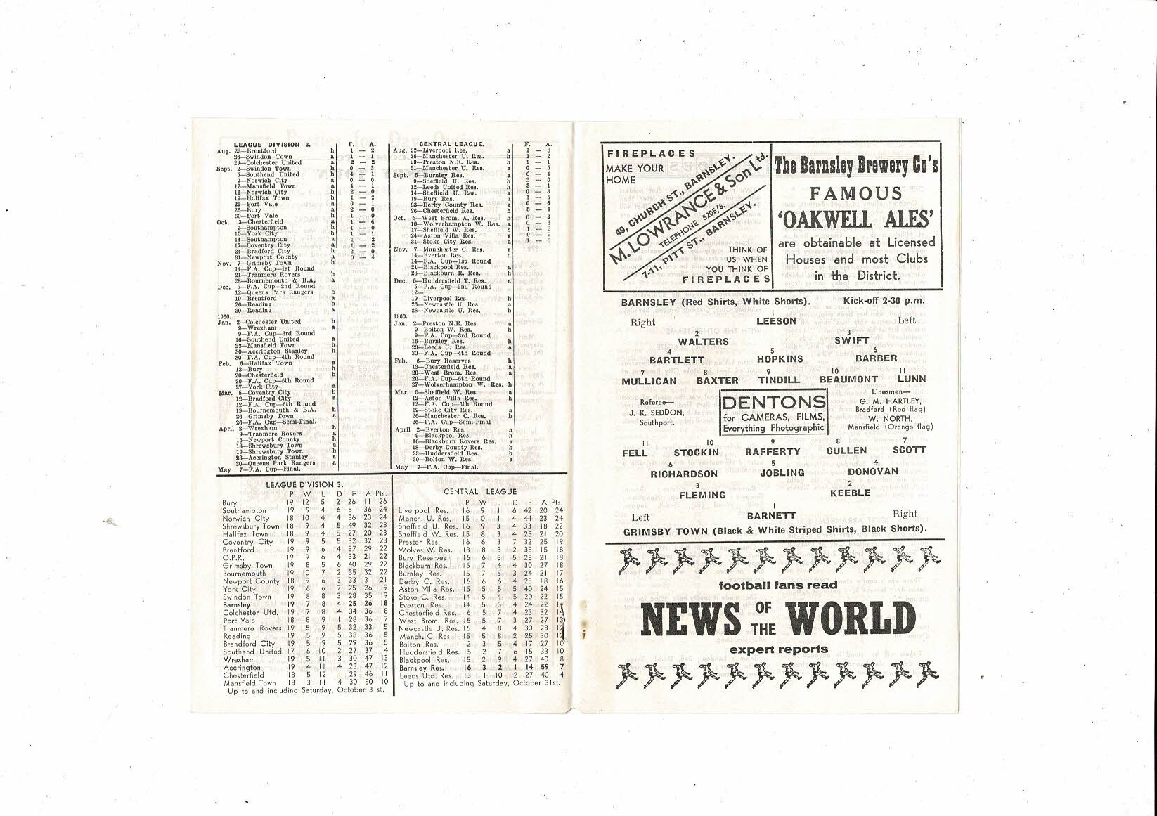 1959/60 Barnsley v Grimsby Town Football Programme