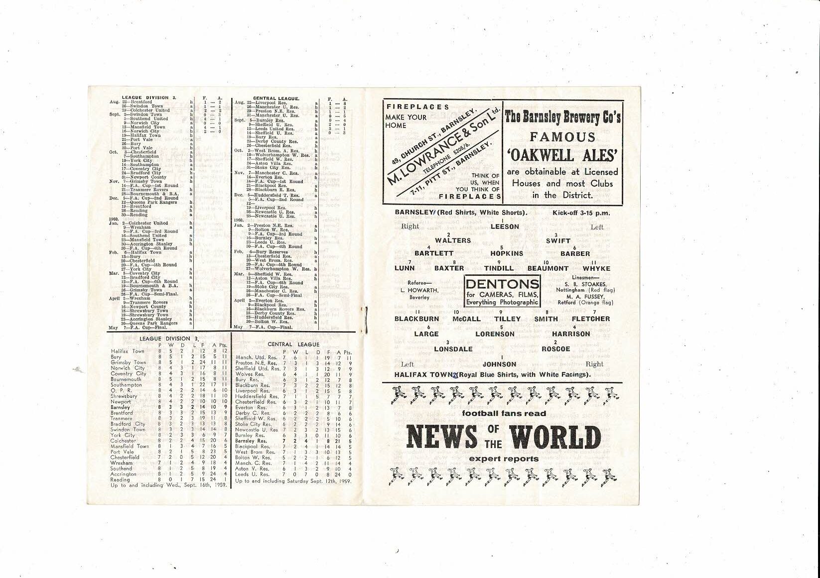 1959/60 Barnsley v Halifax Town Football Programme