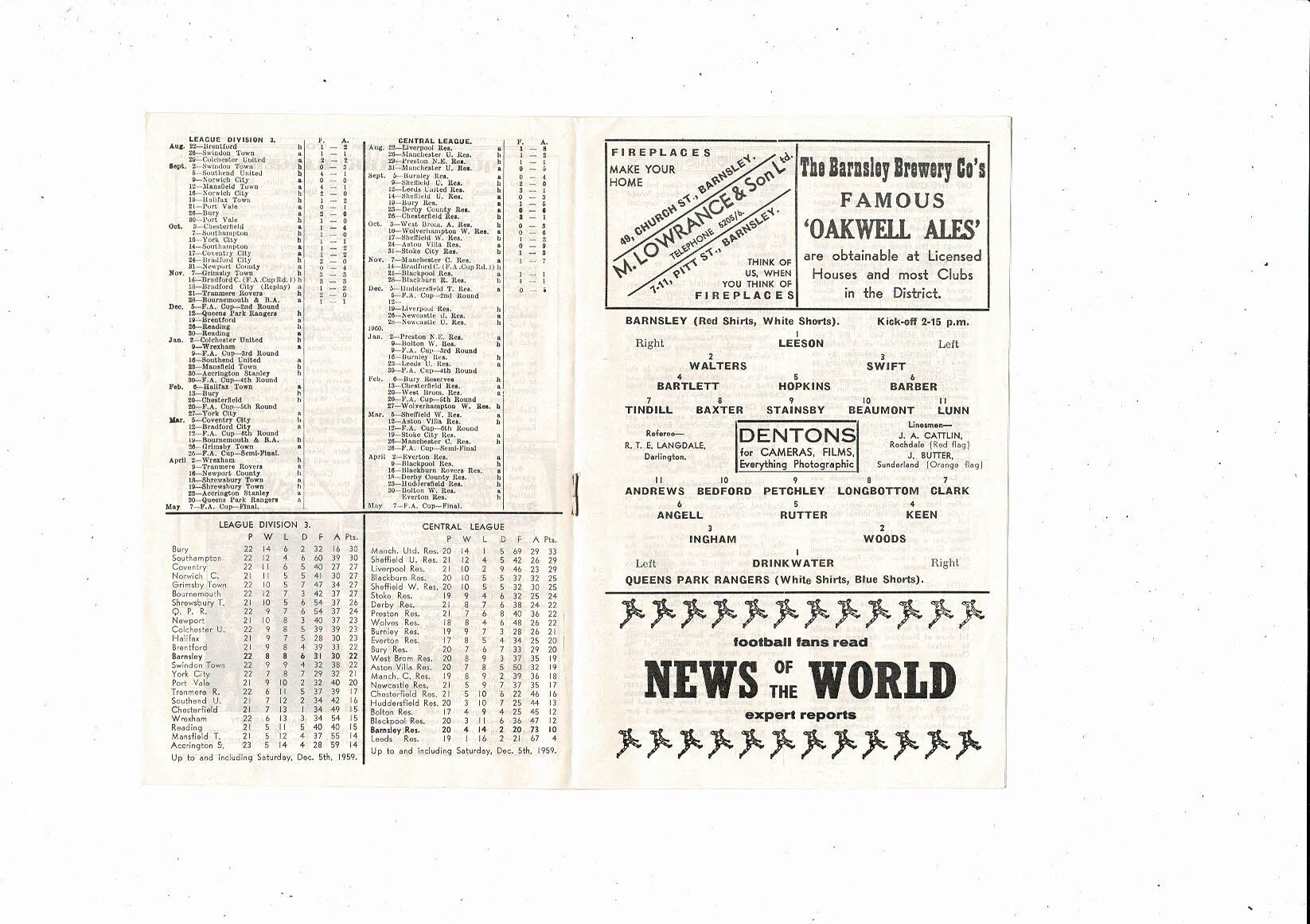 1959/60 Barnsley v Queens Park Rangers Football Programme