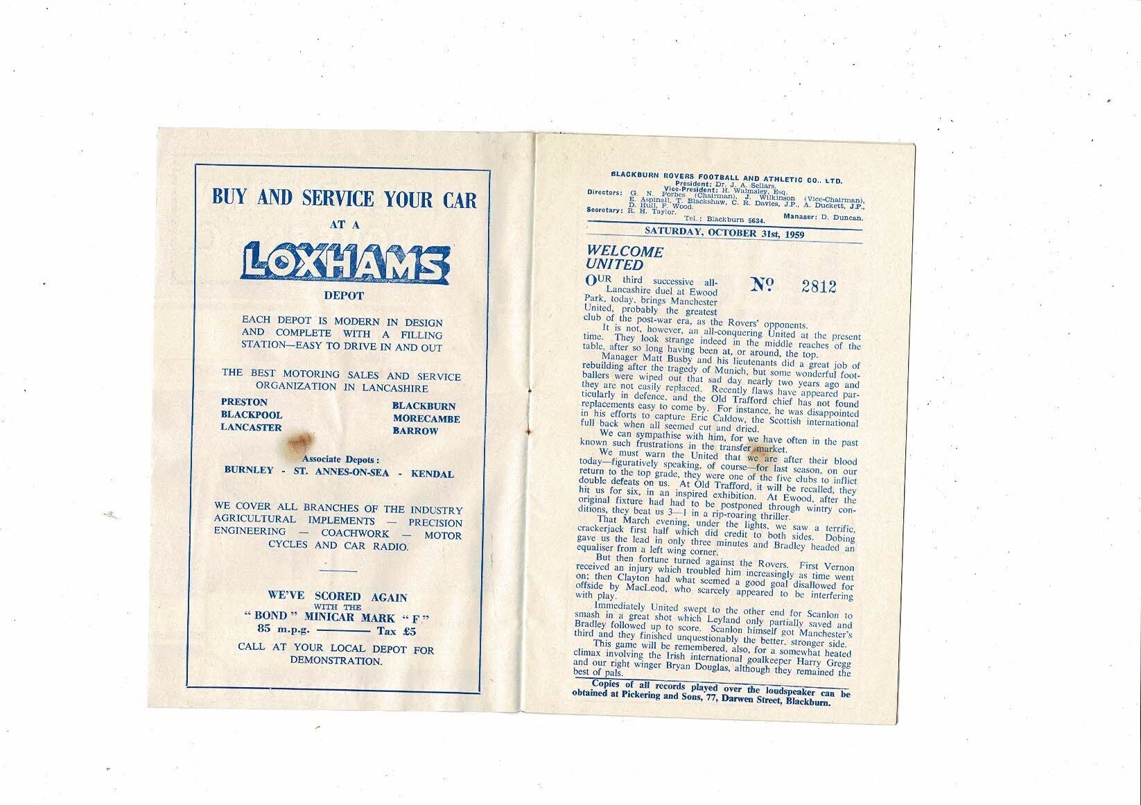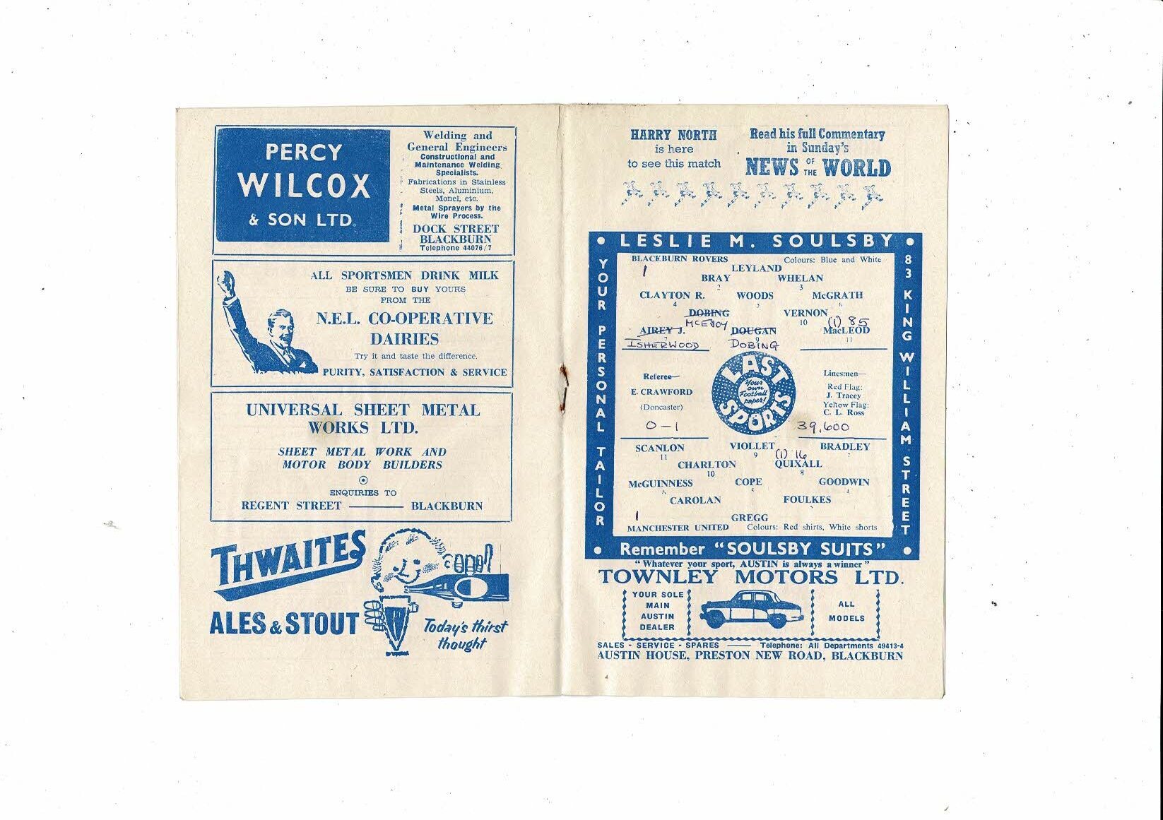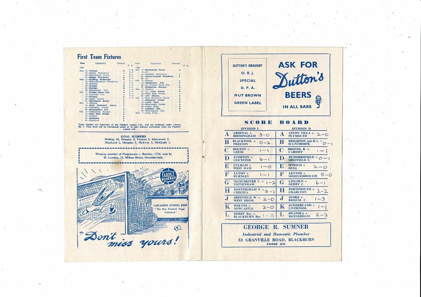 1959/60 Blackburn Rovers v Manchester United Football Programme