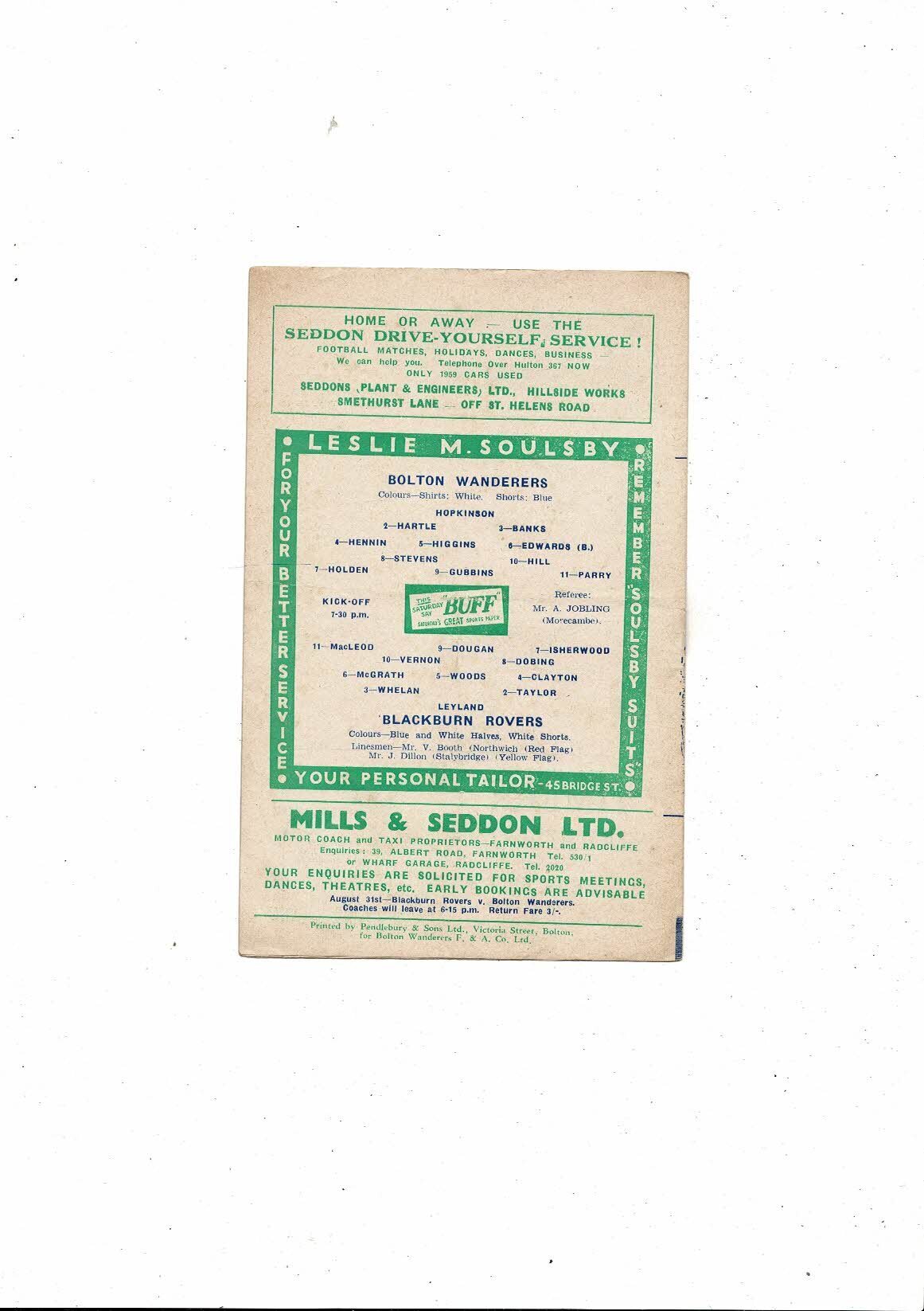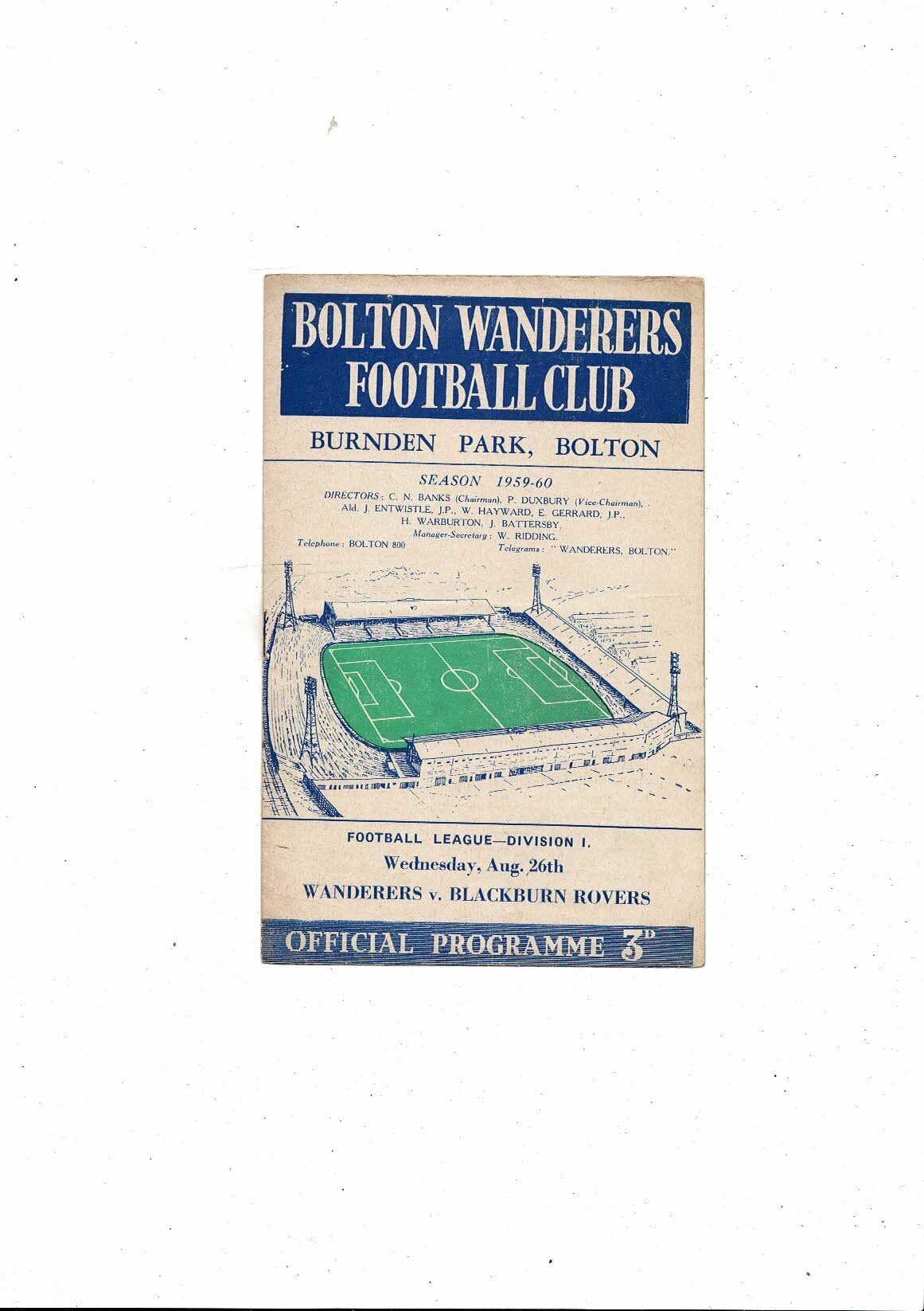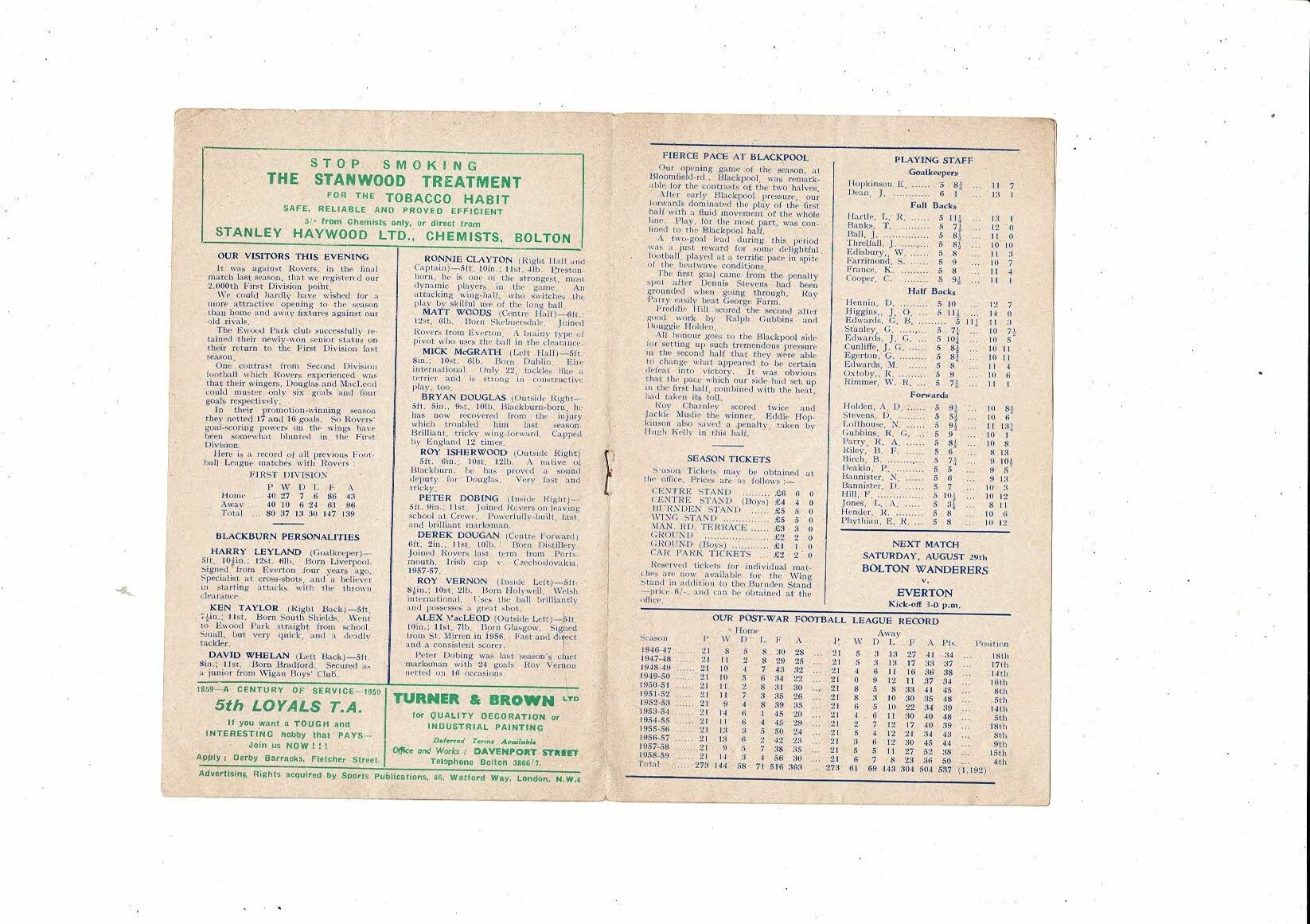1959/60 Bolton Wanderers v Blackburn Rovers Football Programme