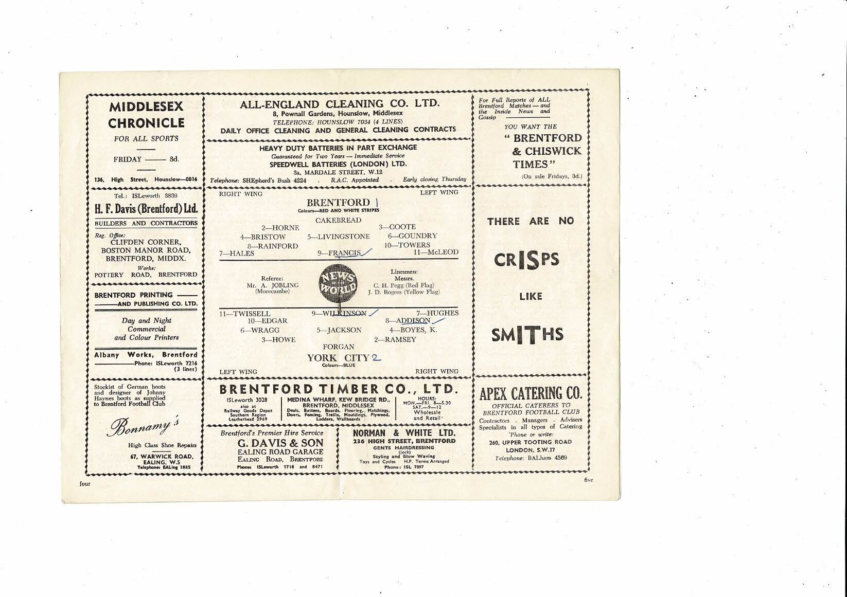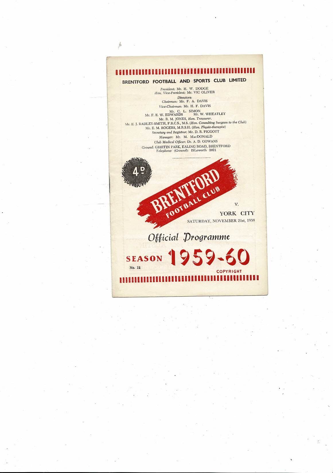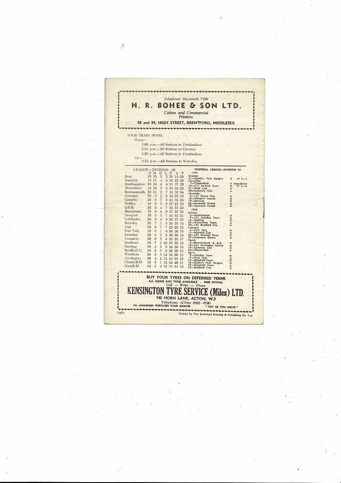 1959/60 Brentford v York City Football Programme