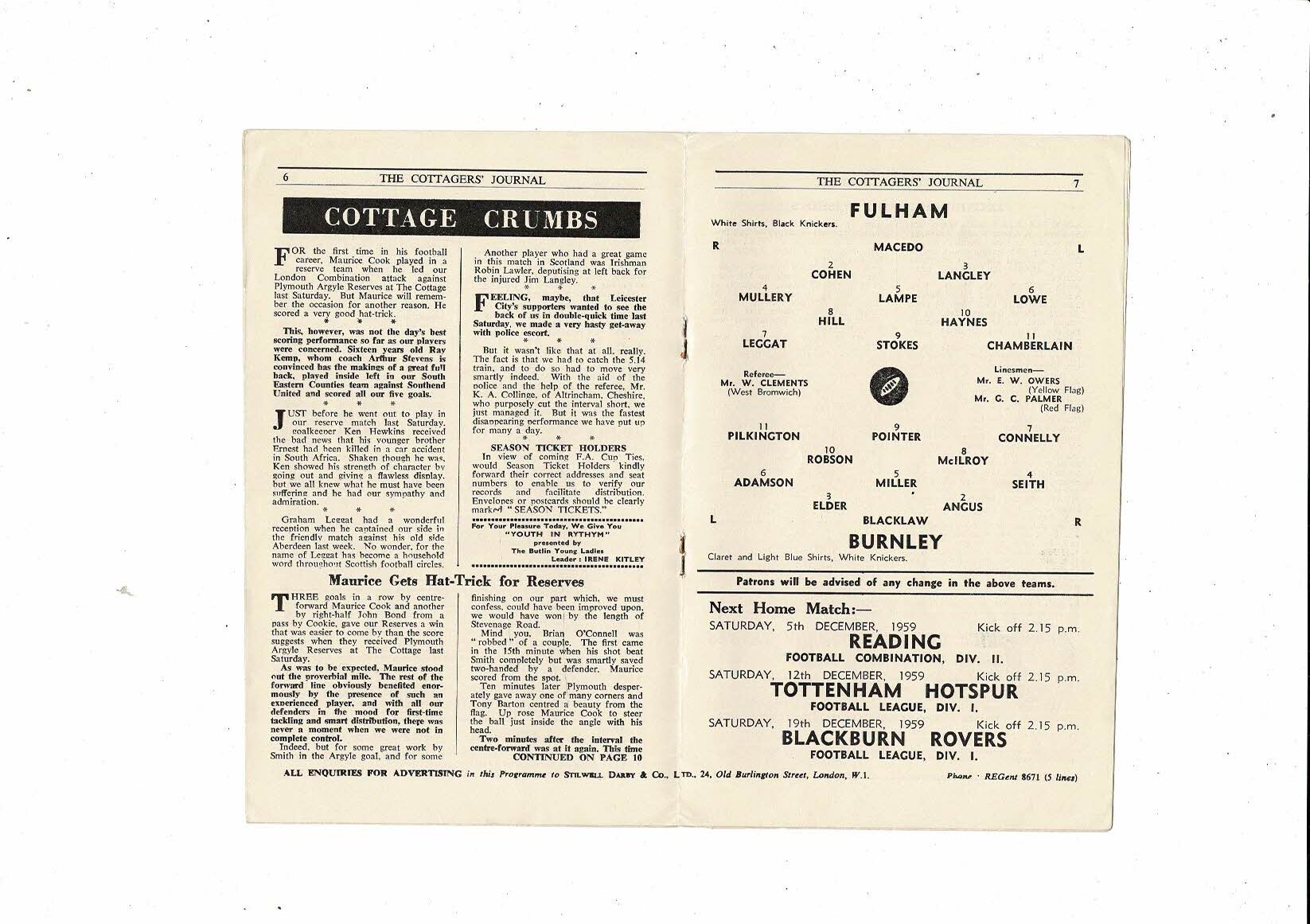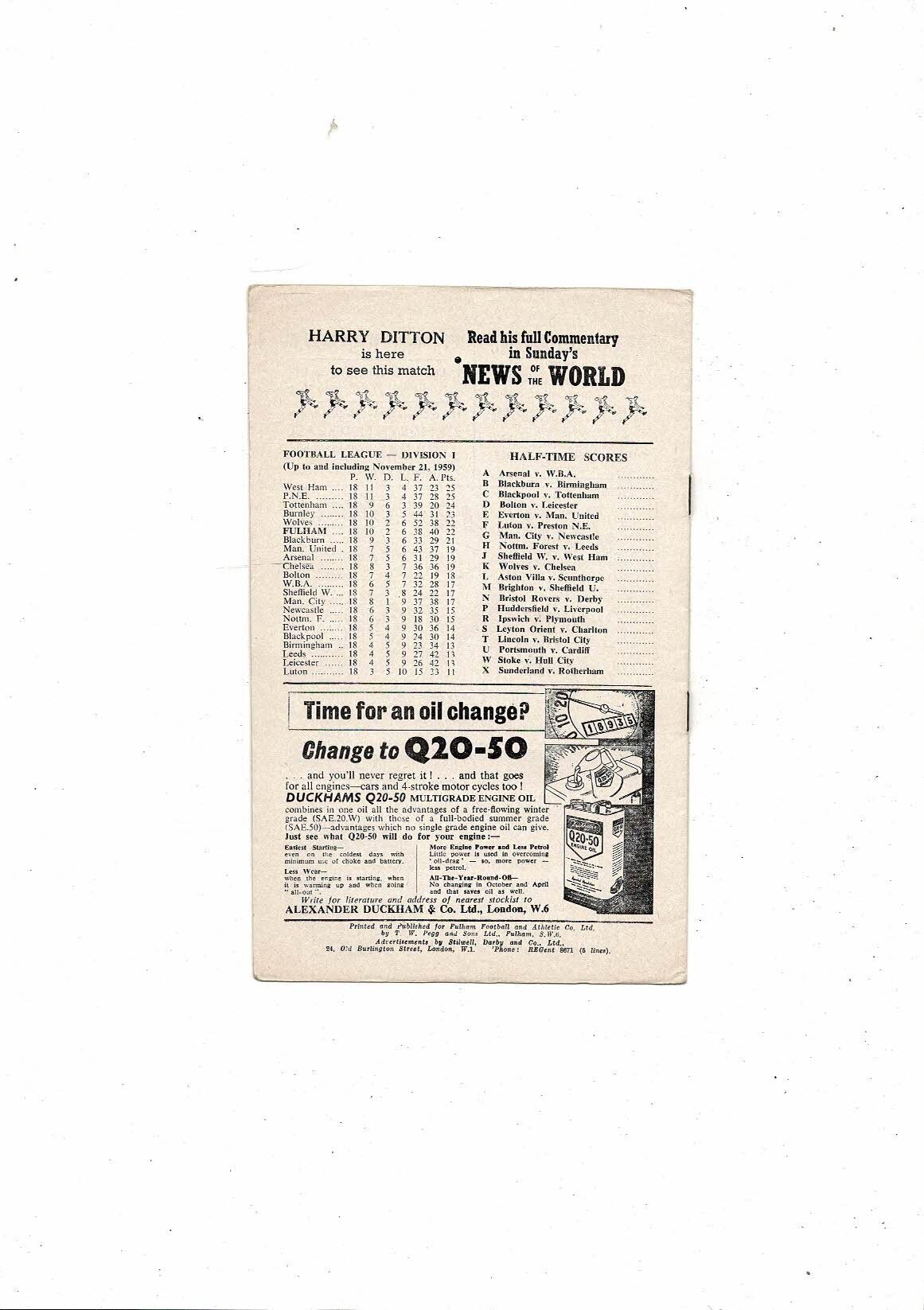 1959/60 Fulham v Burnley Football Programme Burnley Championship Season