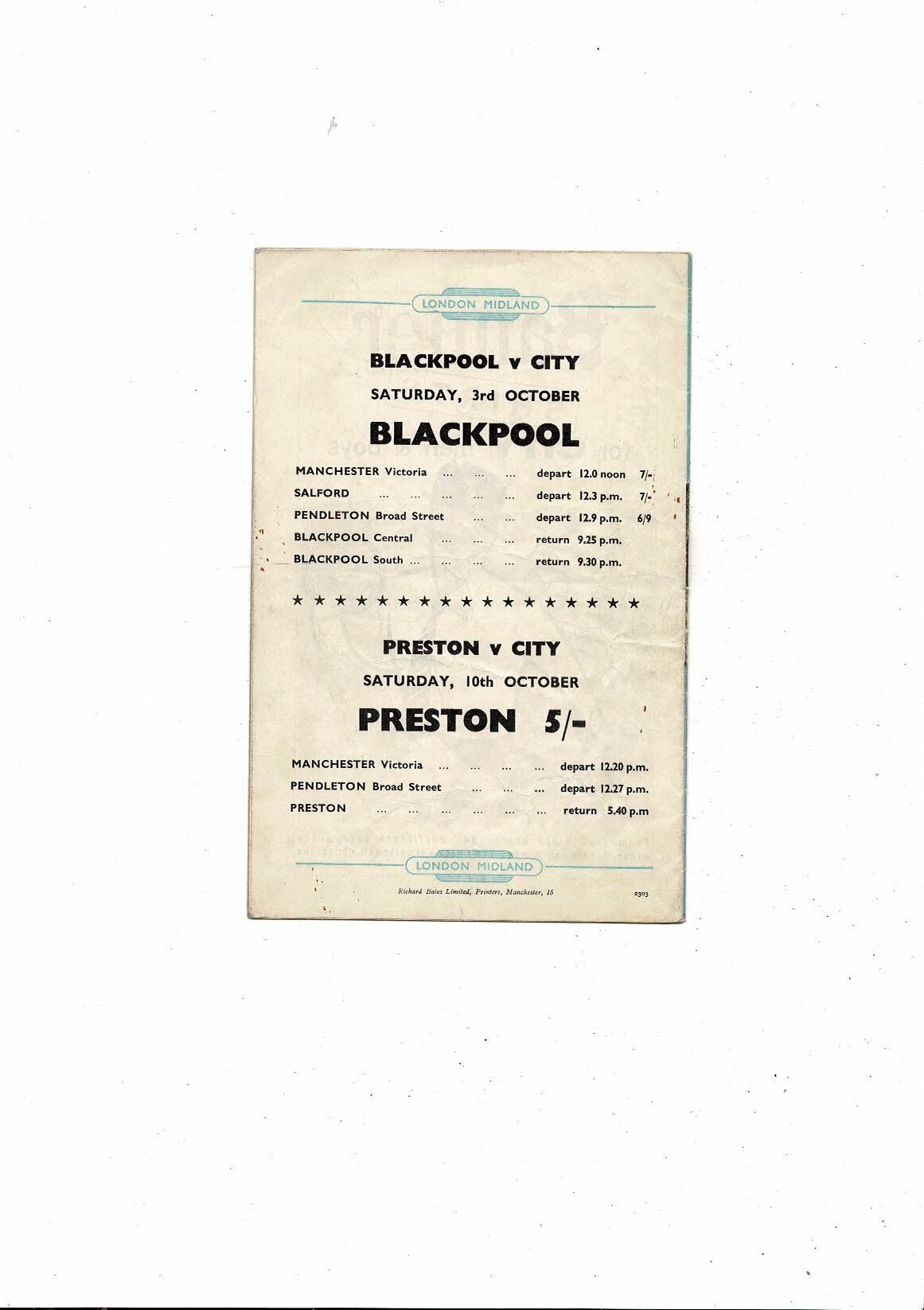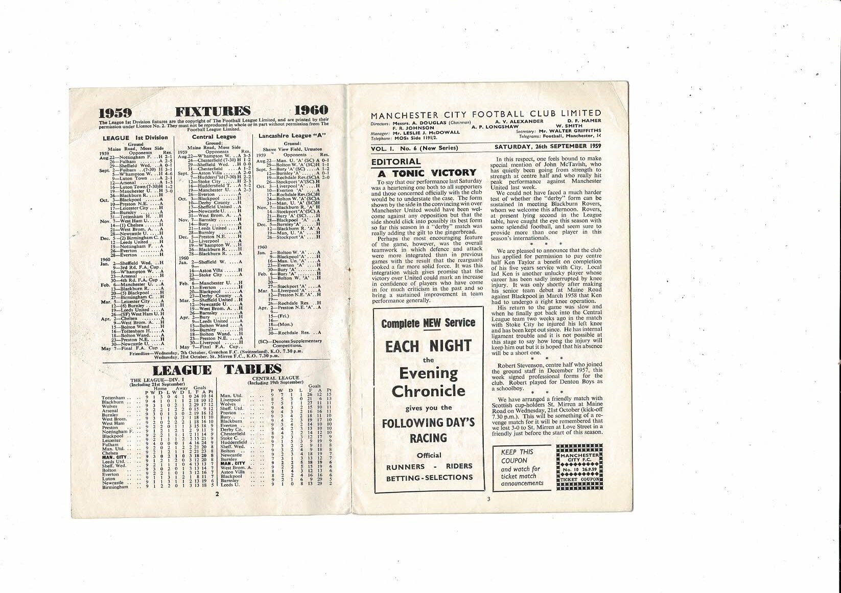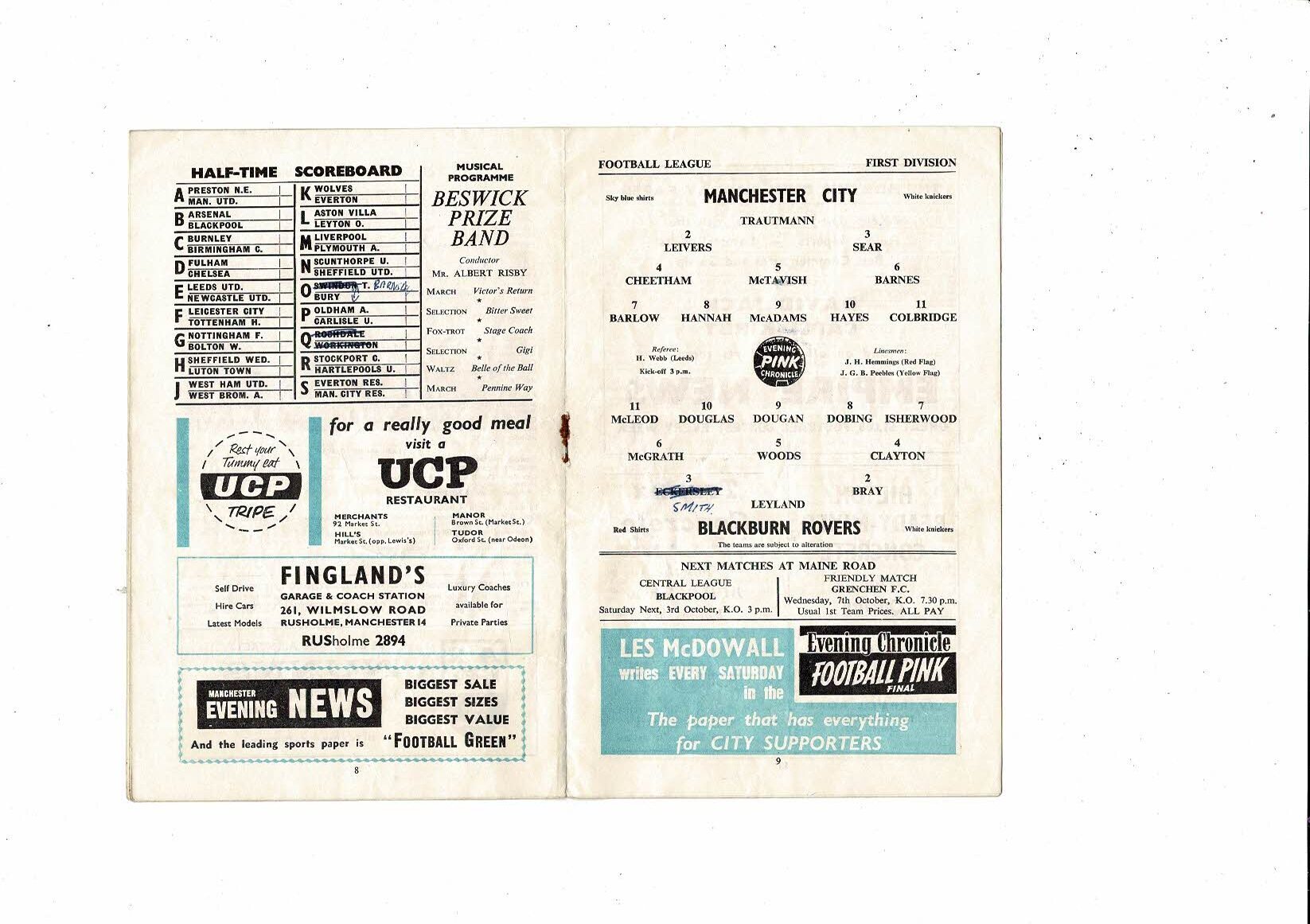 1959/60 Manchester City v Blackburn Rovers Football Programme