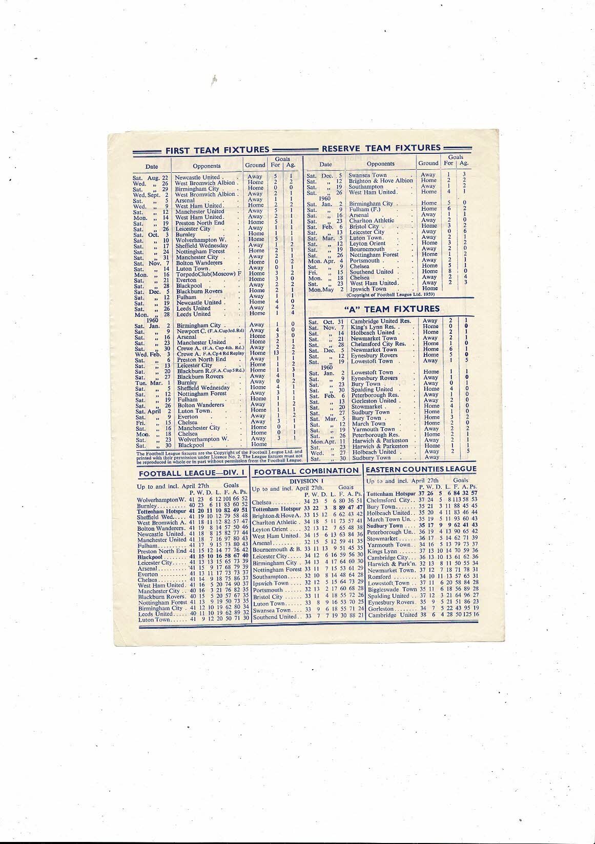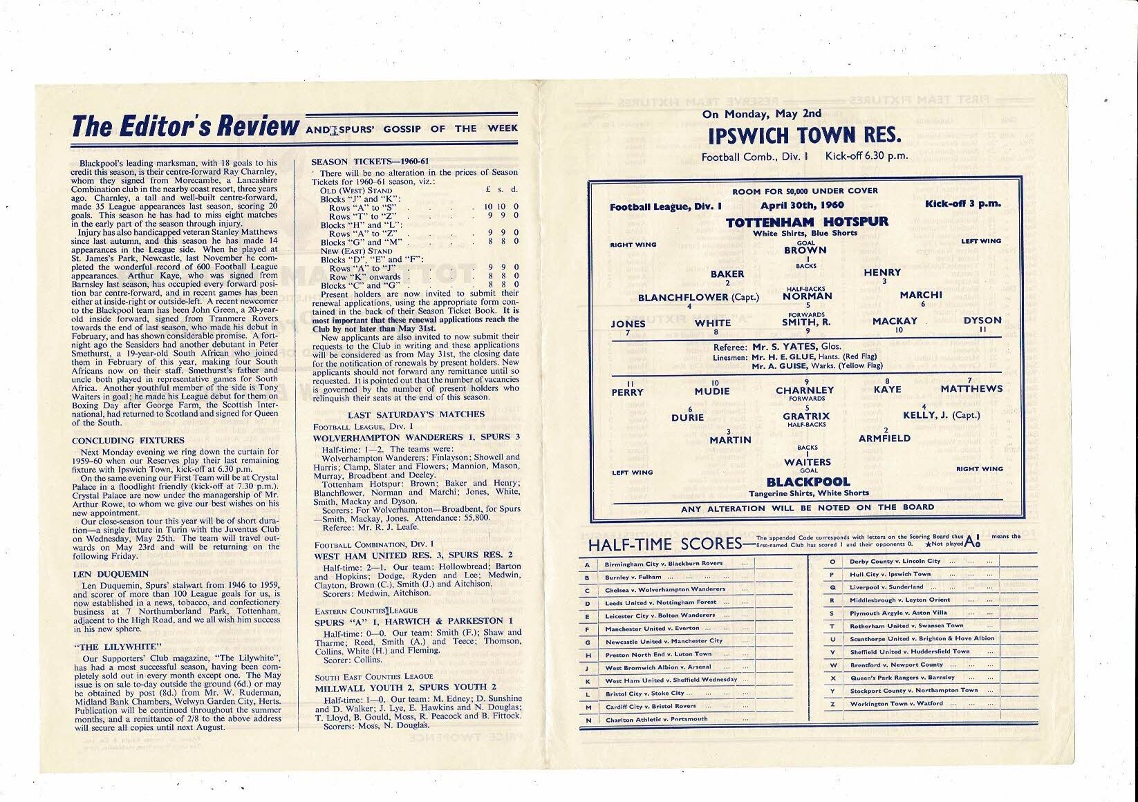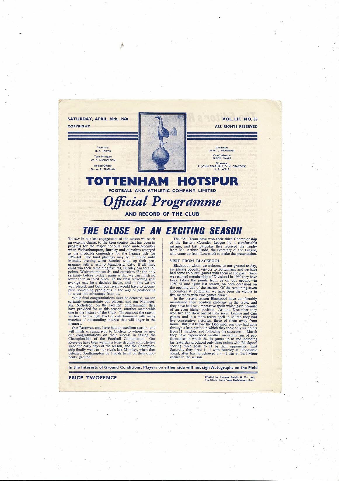 1959/60 Tottenham Hotspur v Blackpool Football Programme