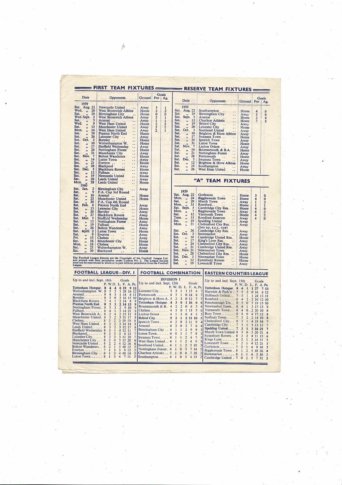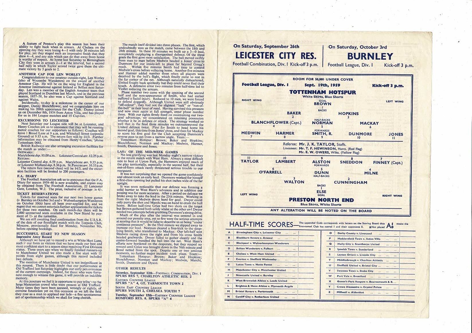 1959/60 Tottenham Hotspur v Preston Football Programme