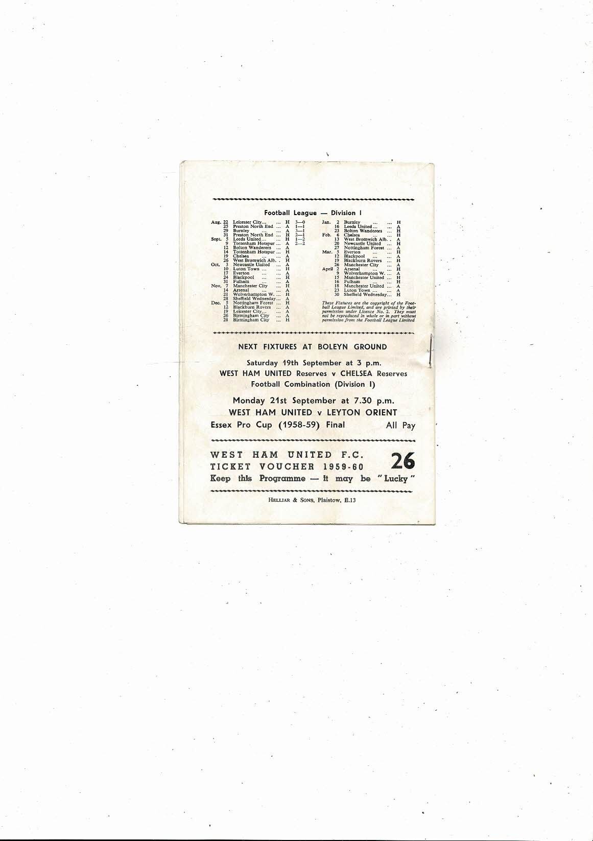 1959/60 West Ham United v Tottenham Hotspur Football Programme