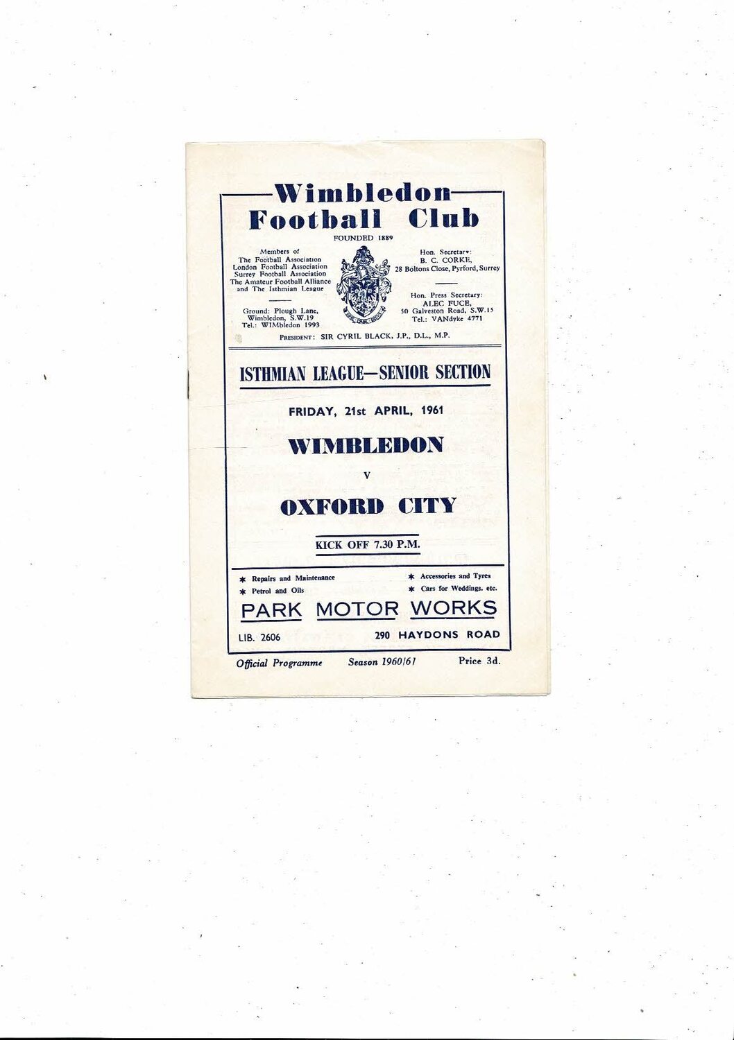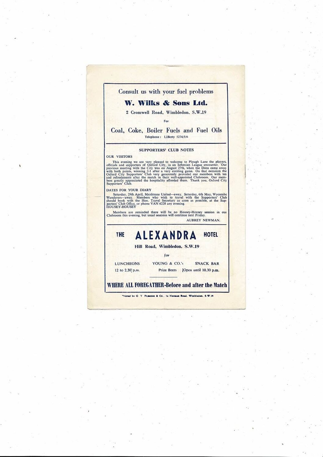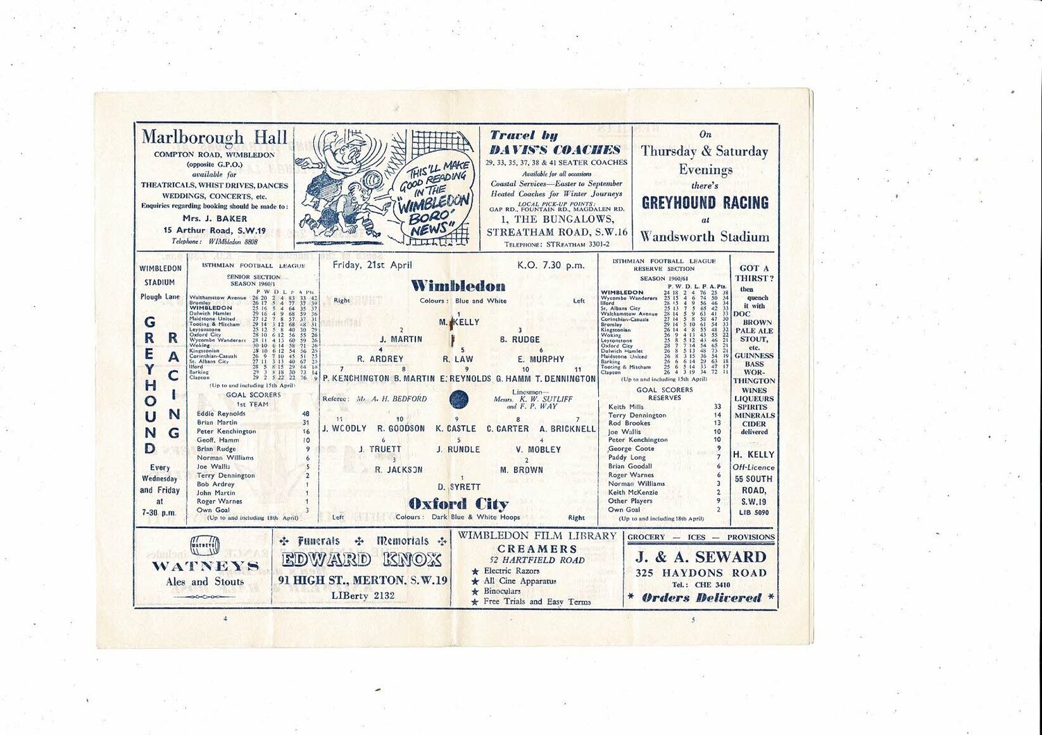 1960/61 Wimbledon v Oxford City Isthmian League Football Programme