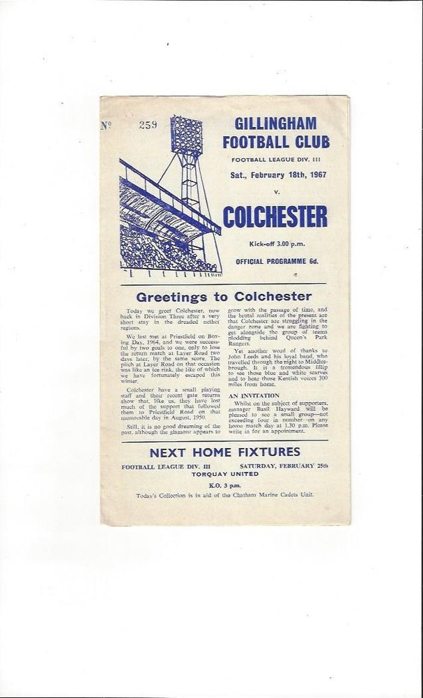 1966/67 Gillingham v Colchester United Football Programme