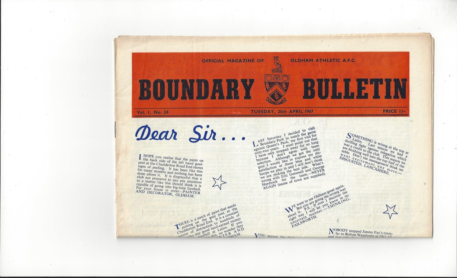 1966/67 Oldham Athletic v Oxford United Football Programme