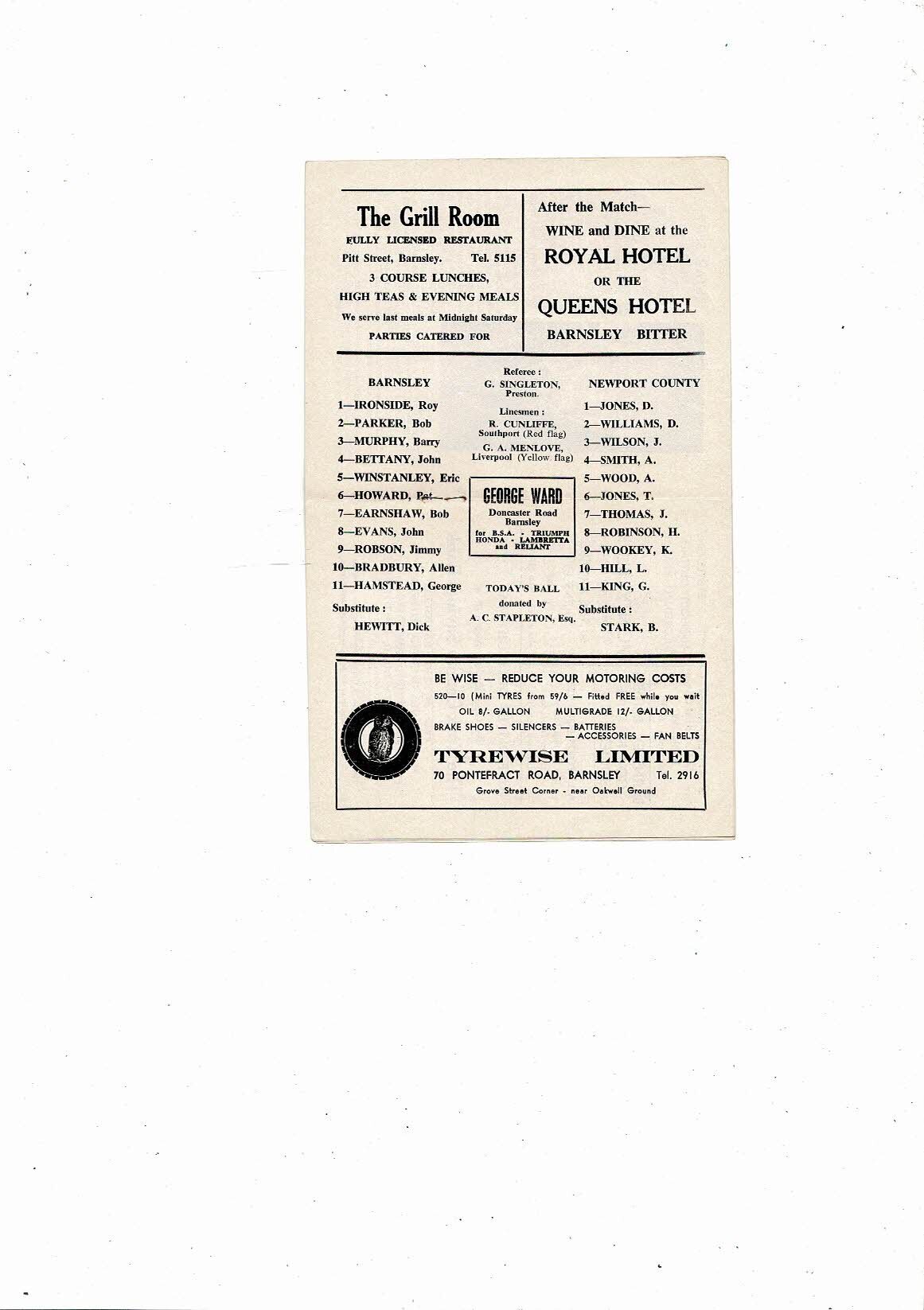 1967/68 Barnsley v Newport County Football Programme