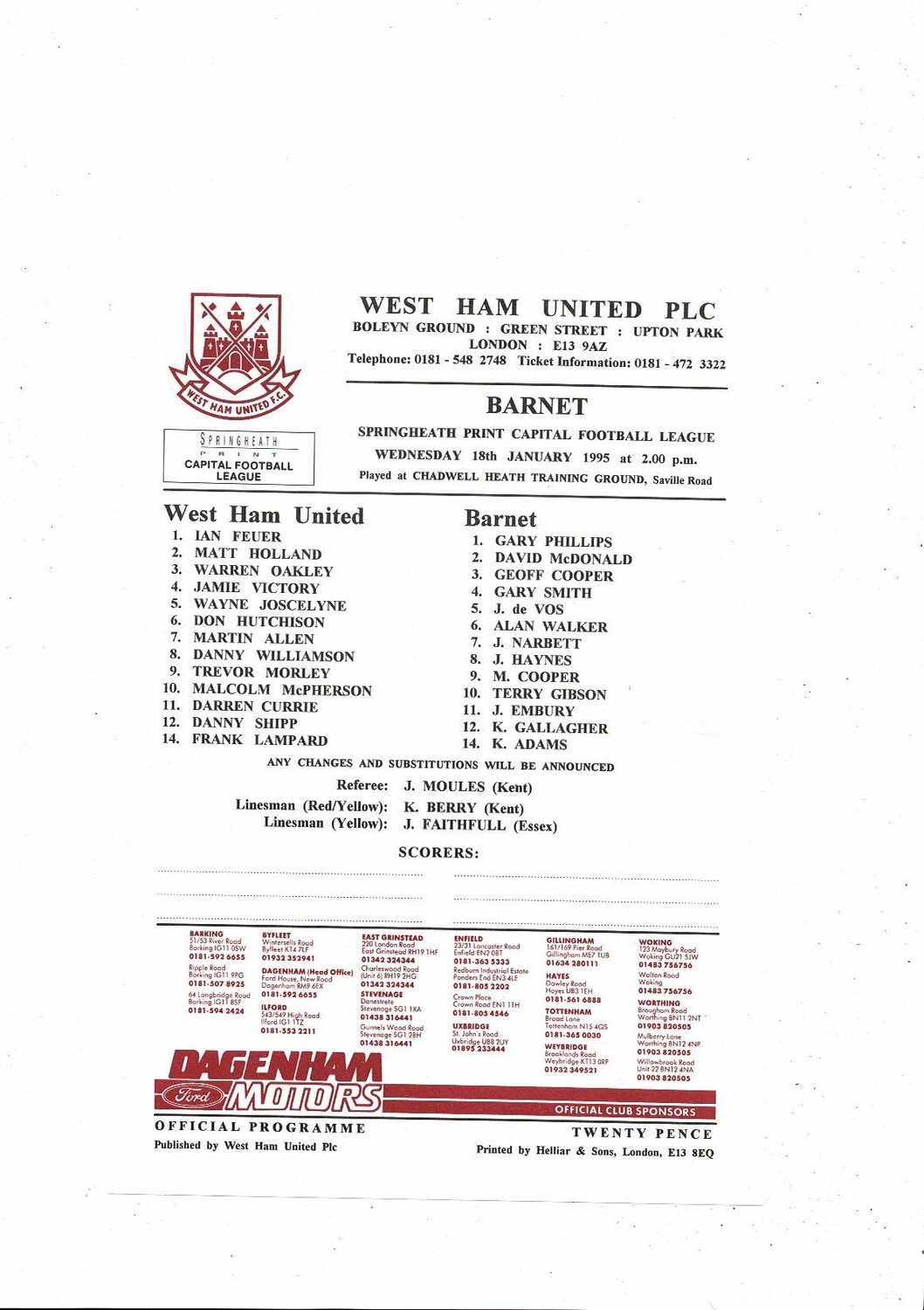 West Ham United v Barnet Capital League Football Programme 1994/95 Jan
