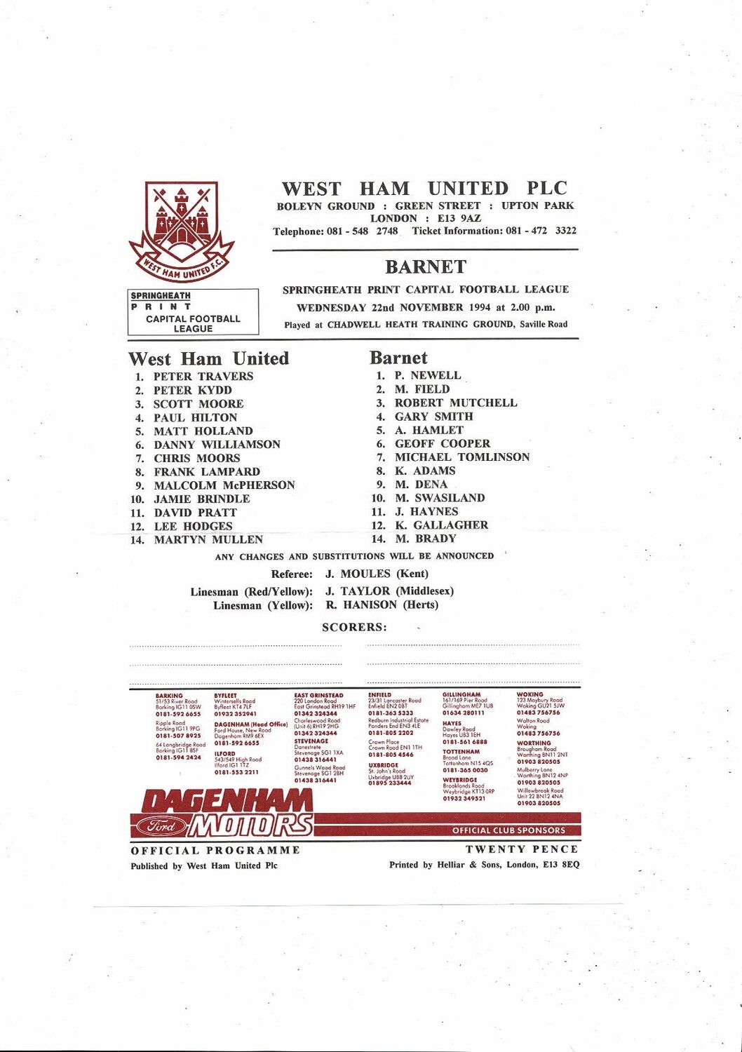 West Ham United v Barnet Capital League Football Programme 1994/95 Nov