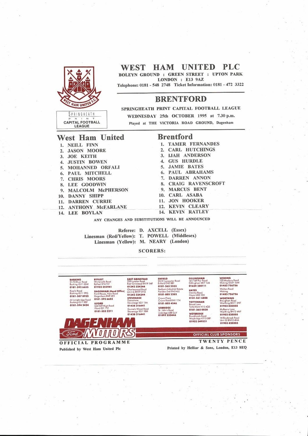 West Ham United v Brentford Capital League Football Programme 1995/96