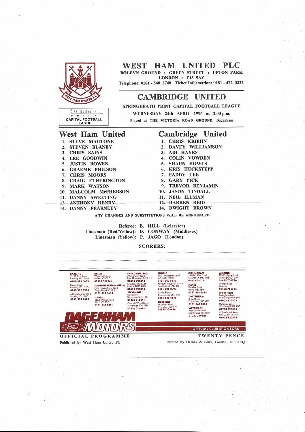 West Ham United v Cambridge United Capital League Football Programme 1995/96