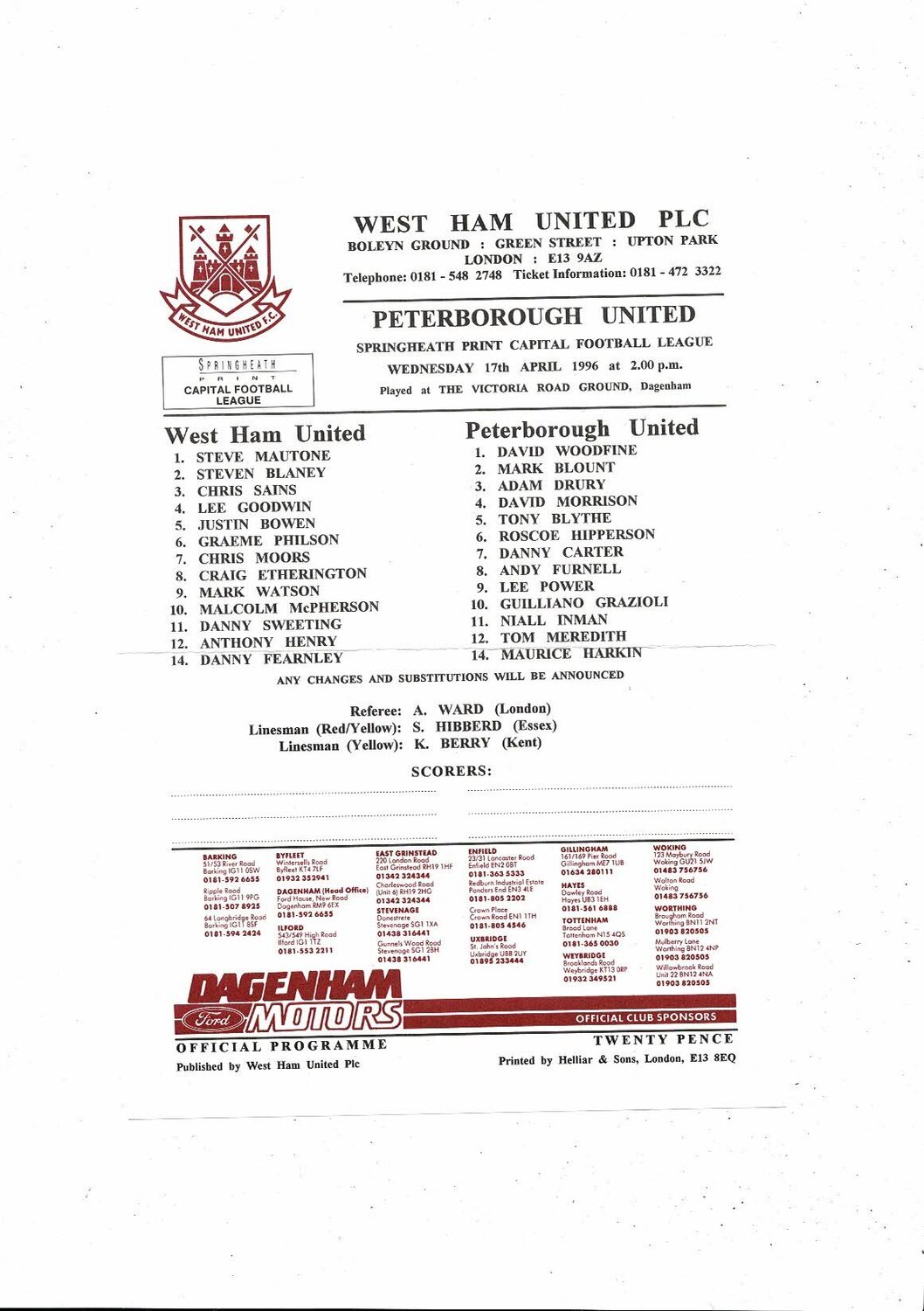 West Ham United v Peterborough United Capital League Football Programme 1995/96